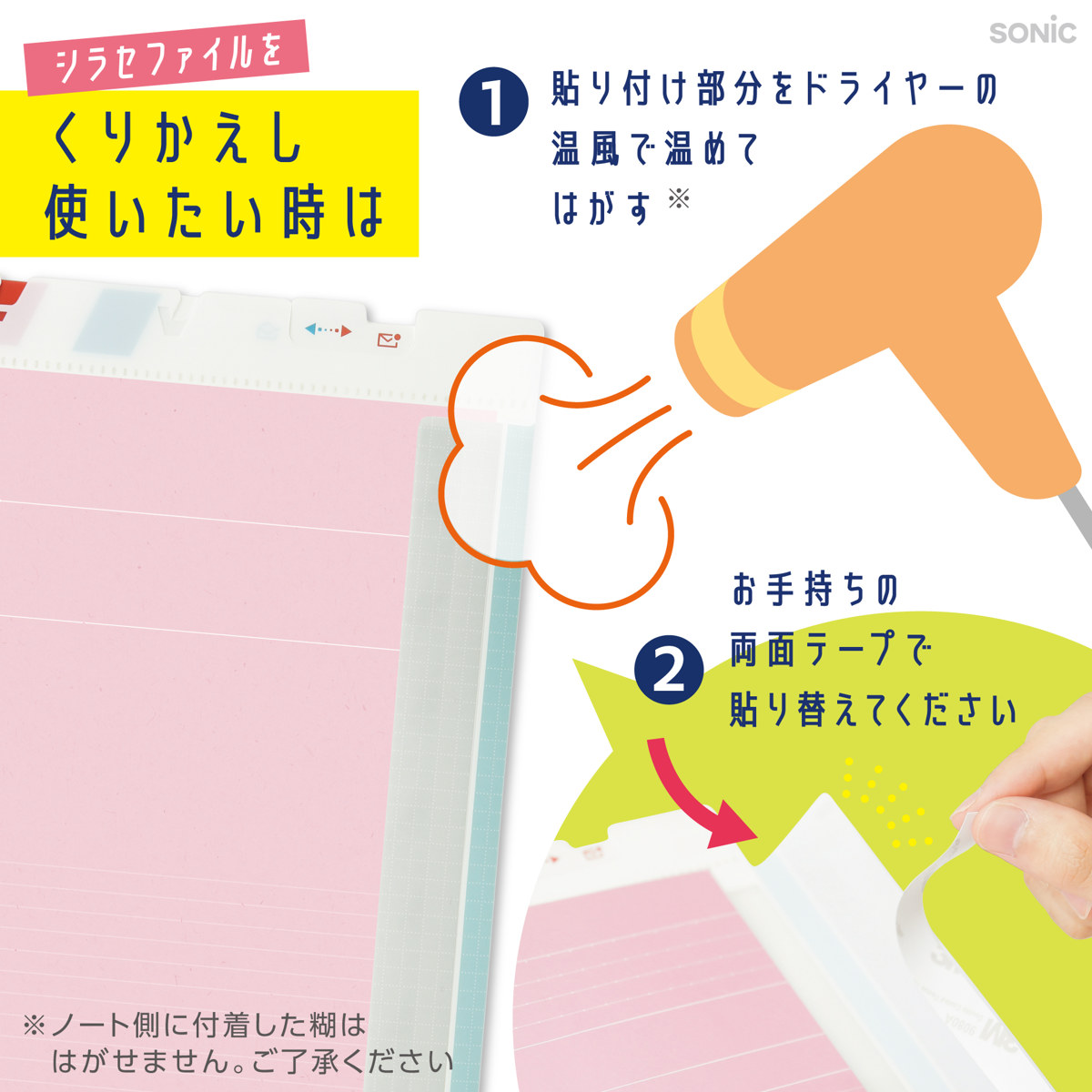 ファイルには両面テープ付きです。ノートの表紙に簡単に貼り付けられるので、すぐに使い始められます。