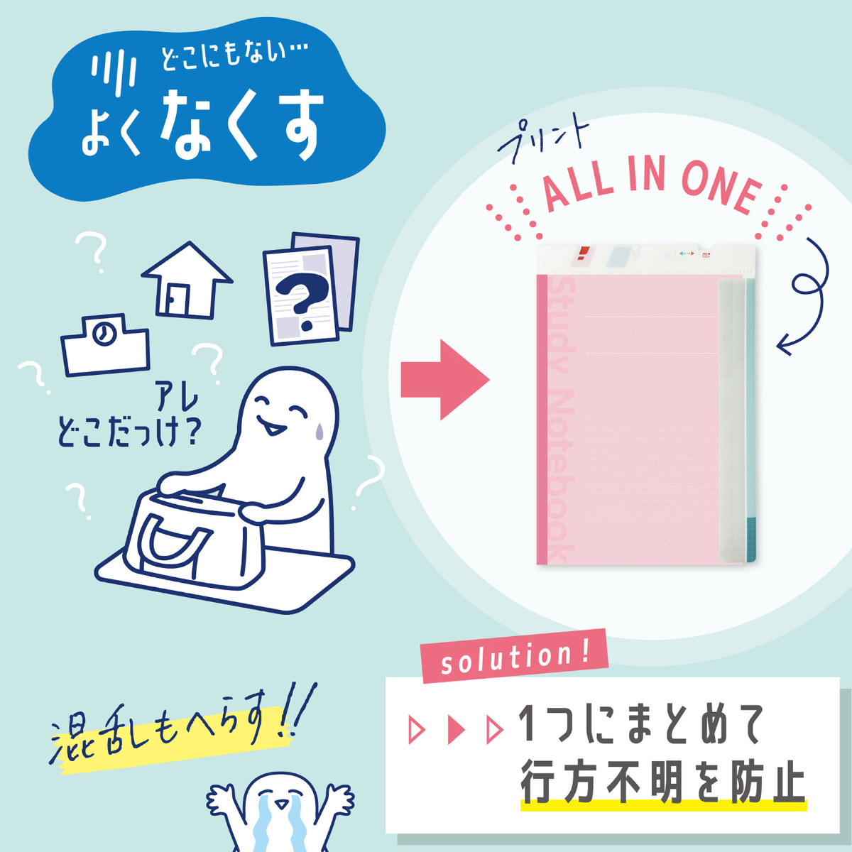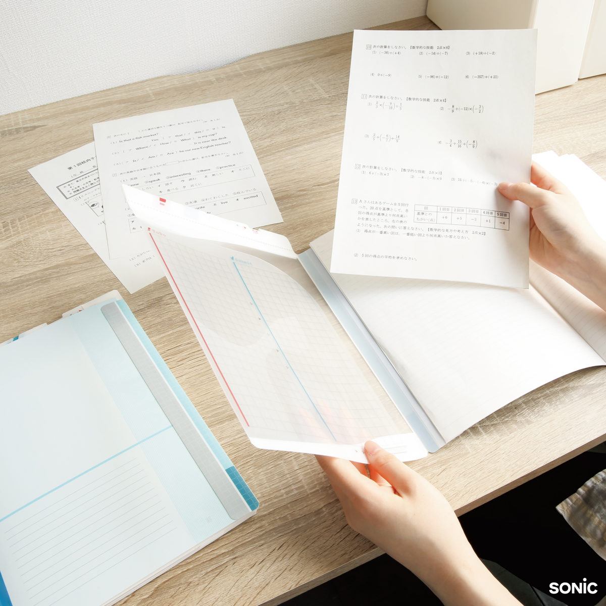 学校や塾で配られるプリントを管理するのに役立つファイルです。ノートに貼り付けて使うので科目ごとにプリントを一括管理でき、科目の混在や紛失のリスクを減らせます。