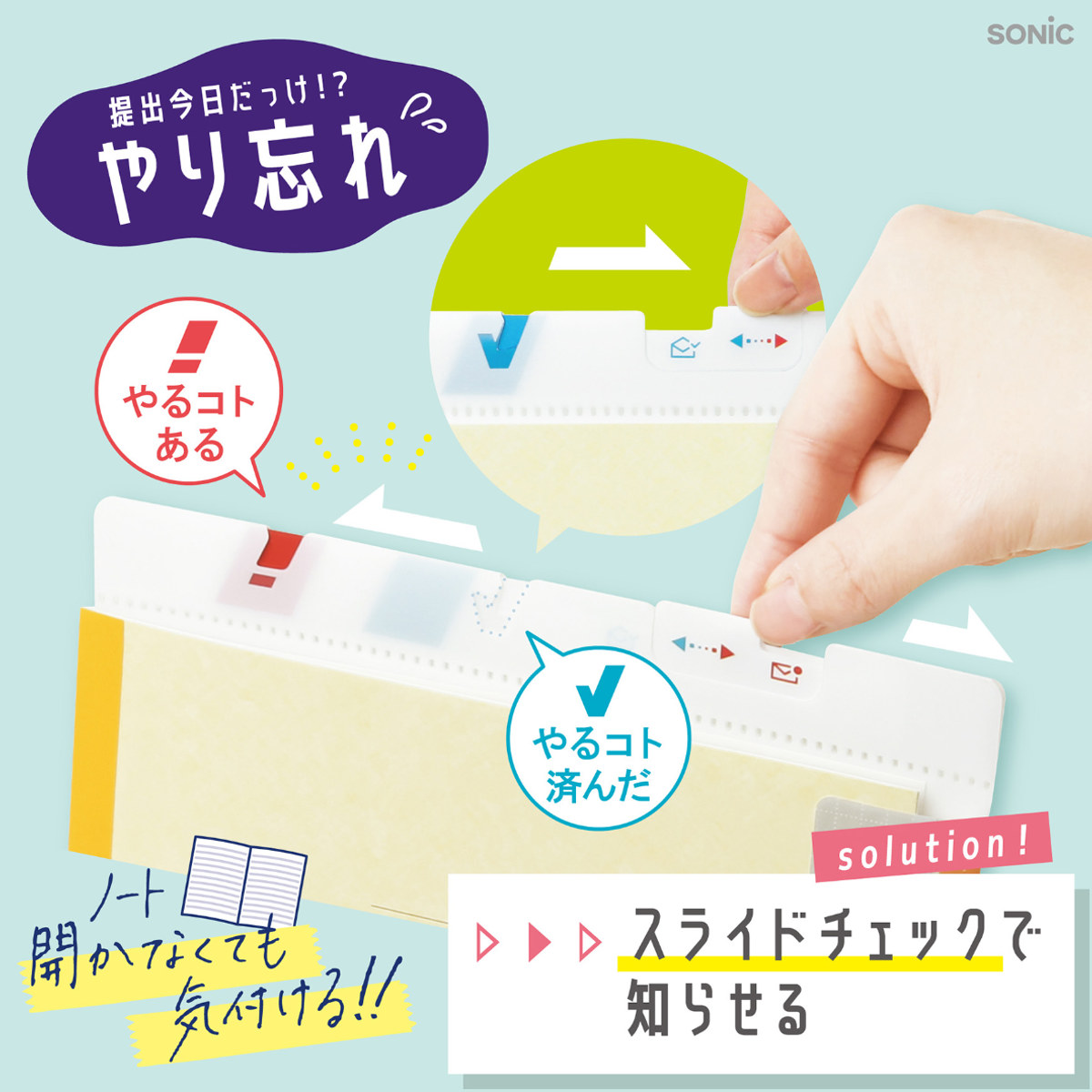 ファイルの上部には2種類のマークを切り替えられるスライドチェックが付いています。宿題が配られたら「未読マーク」、宿題を済ませたら「既読マーク」と目印を付けられるので、一目で進捗を管理できます。