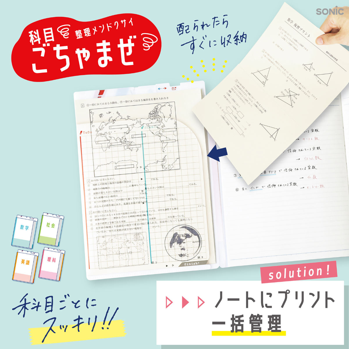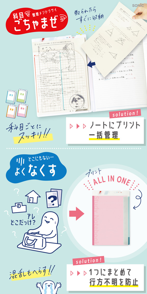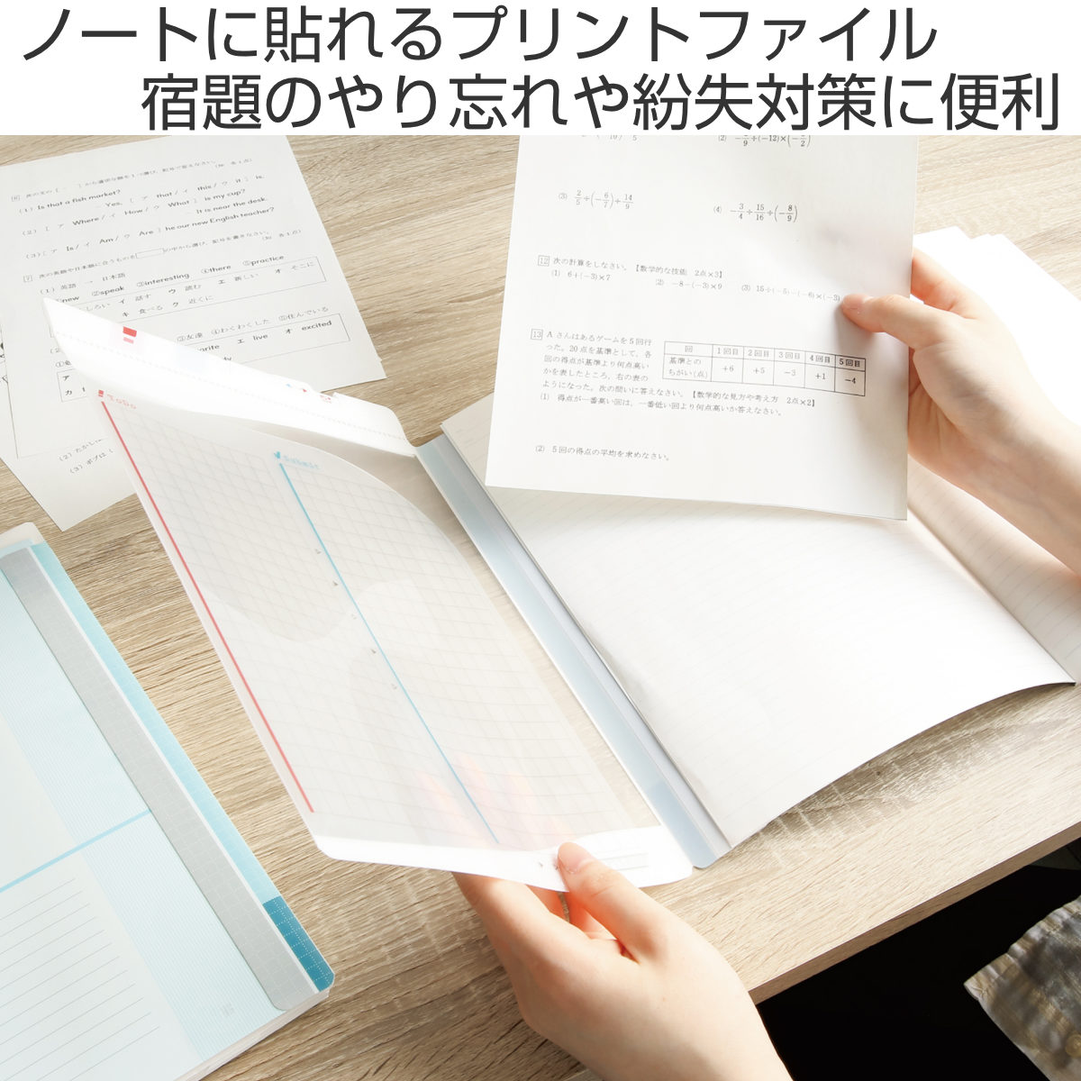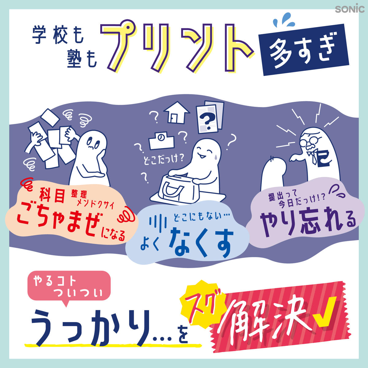 学校や塾で配られるプリントを管理するのに役立つファイルです。ノートに貼り付けて使うので科目ごとにプリントを一括管理でき、科目の混在や紛失のリスクを減らせます。