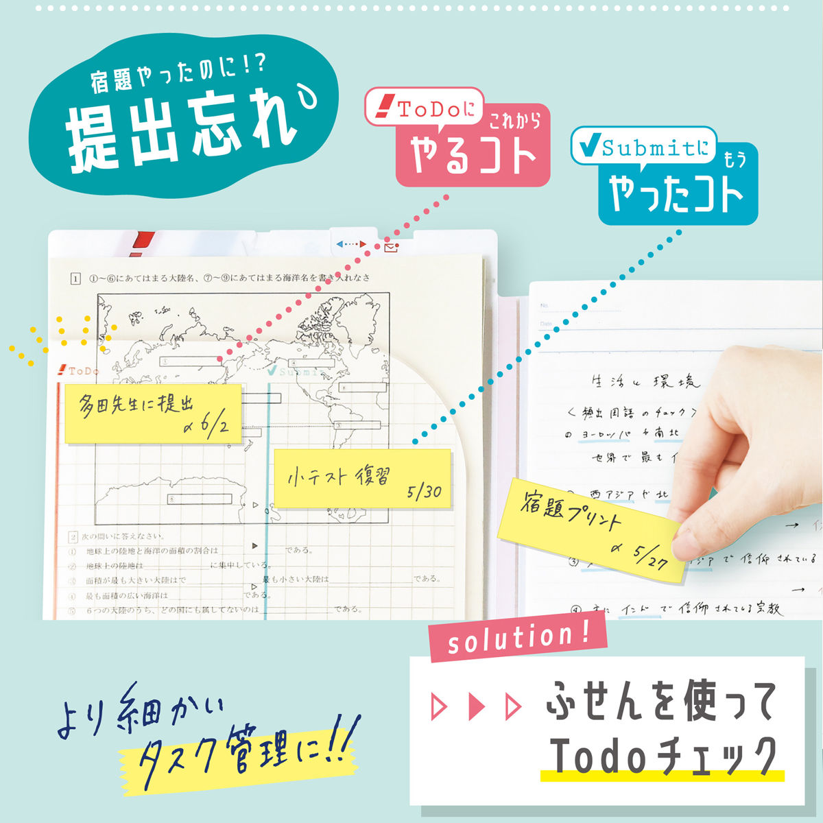 ファイルのポケット内側は付箋を貼ってTODOチェックとして使用できます。ノートを開くだけですぐに確認できるので、宿題の提出忘れ対策や、テスト勉強の計画に便利です。