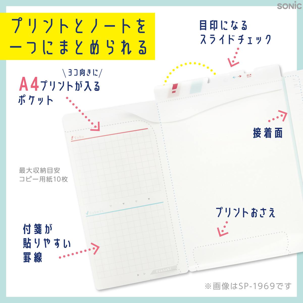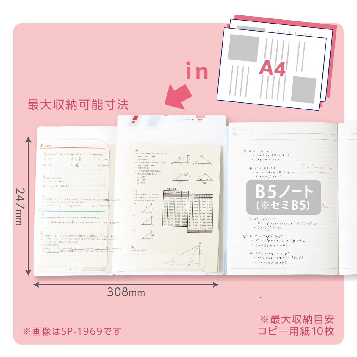 お手持ちのB5ノートに貼り付けられます。ファイルのポケットはA4サイズの用紙を横向きに10枚まで収納できます。