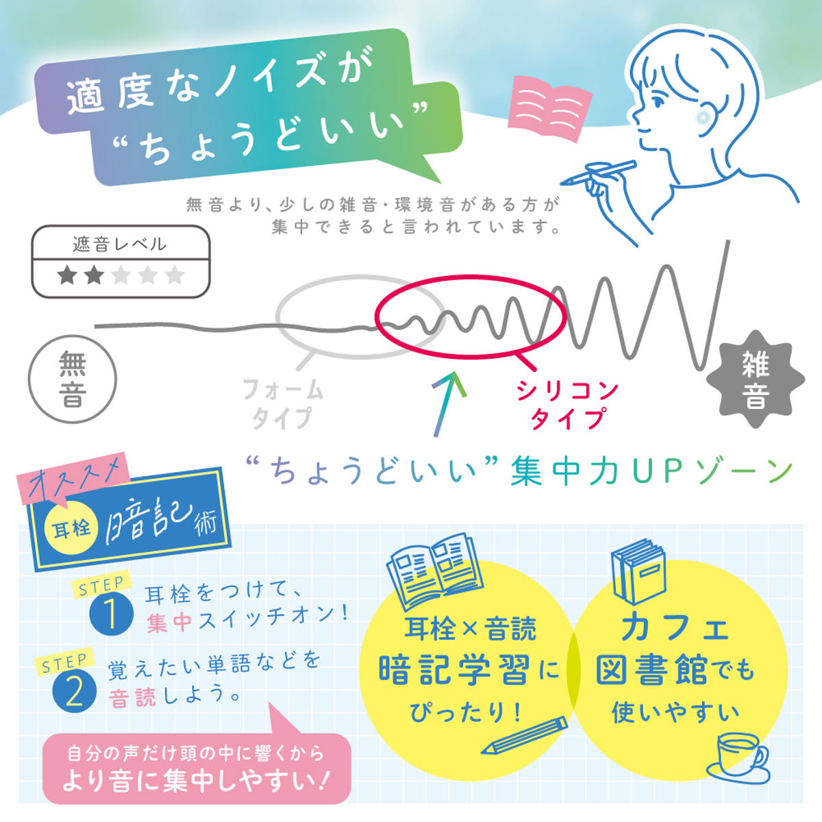 無音では落ち着かない方にも使いやすく、適度なノイズで集中しやすい環境をつくるシリコンタイプの耳栓です。やわらかくフィットし、ほどよい遮音性で「ちょうどいい音空間」をサポートします。暗記効率アップにも繋がります。