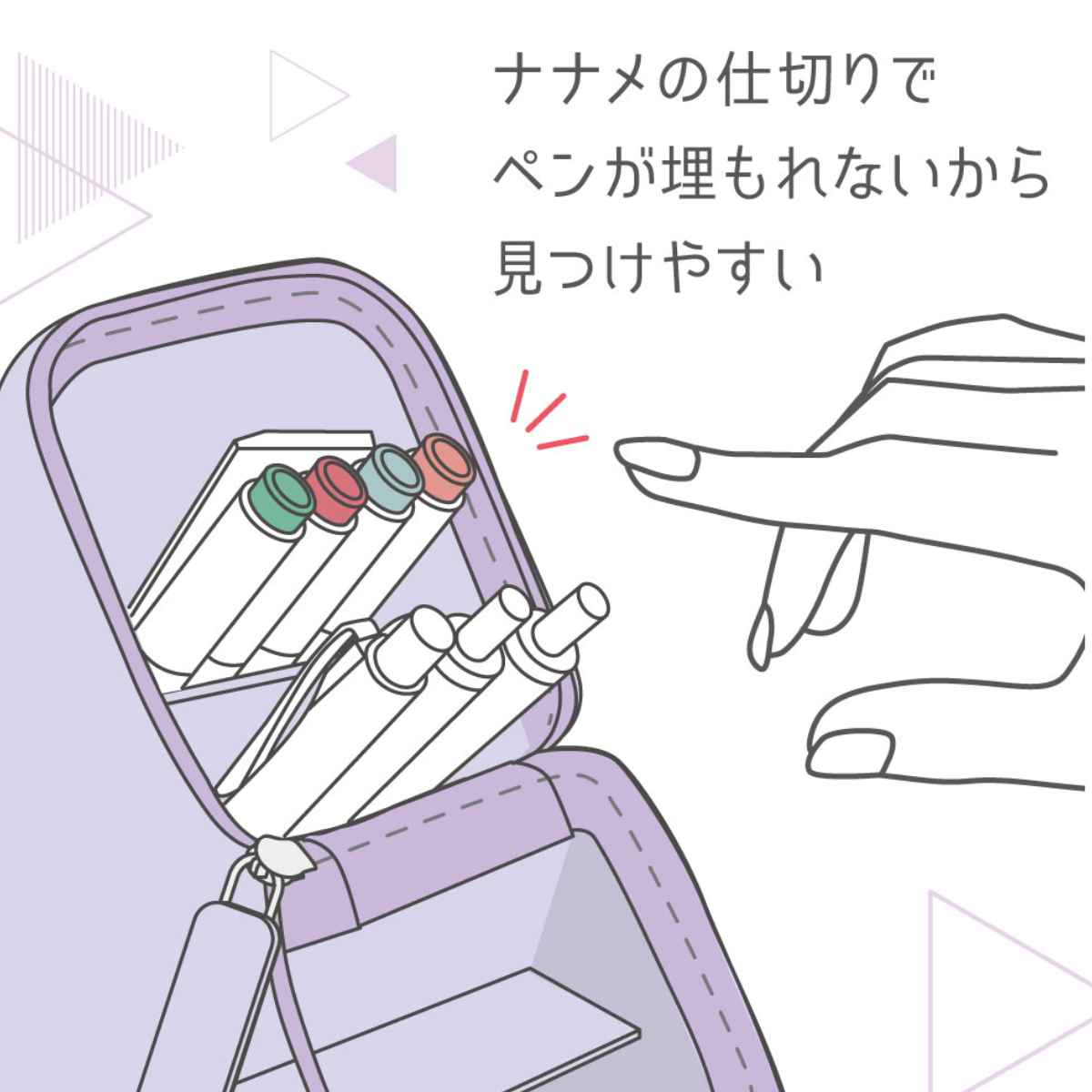 斜め仕切りで中身がひと目で見やすいです。ペン同士が重ならず埋もれないので、たくさん入れても使いたい一本をすぐに取り出せます。