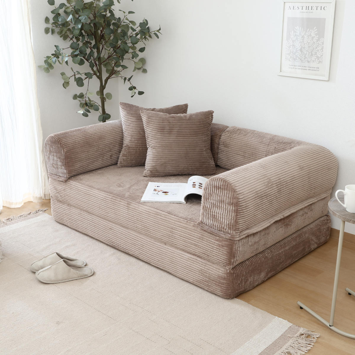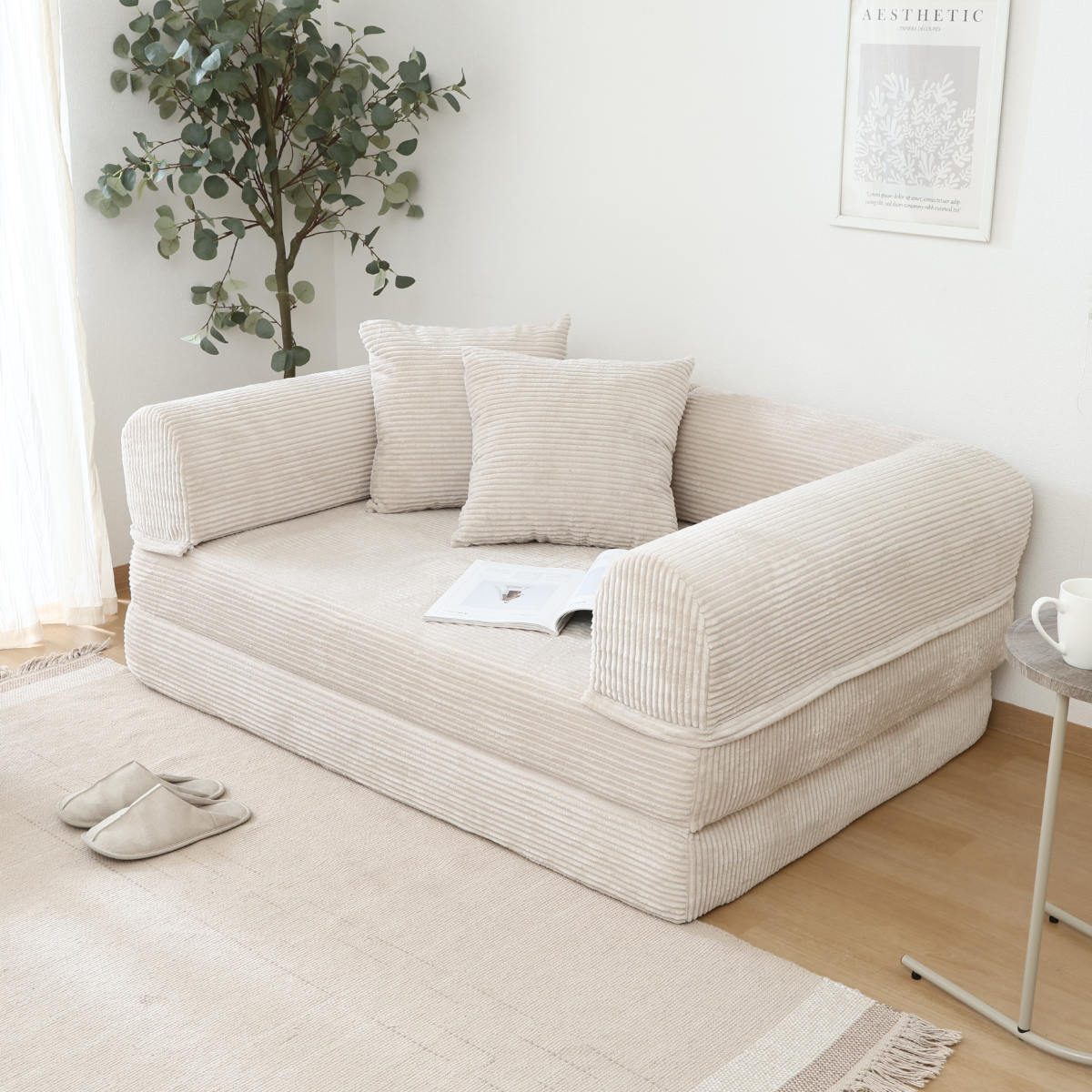 温もりのあるコーデュロイ素材を使用した、折りたたみ式のソファベッドです。 座面を折りたためばコンパクトなソファに、広げればフロア感覚で使えるカウチやベッドスタイルに変身。 省スペースで置けるので、一人暮らしのお部屋にもおすすめです。