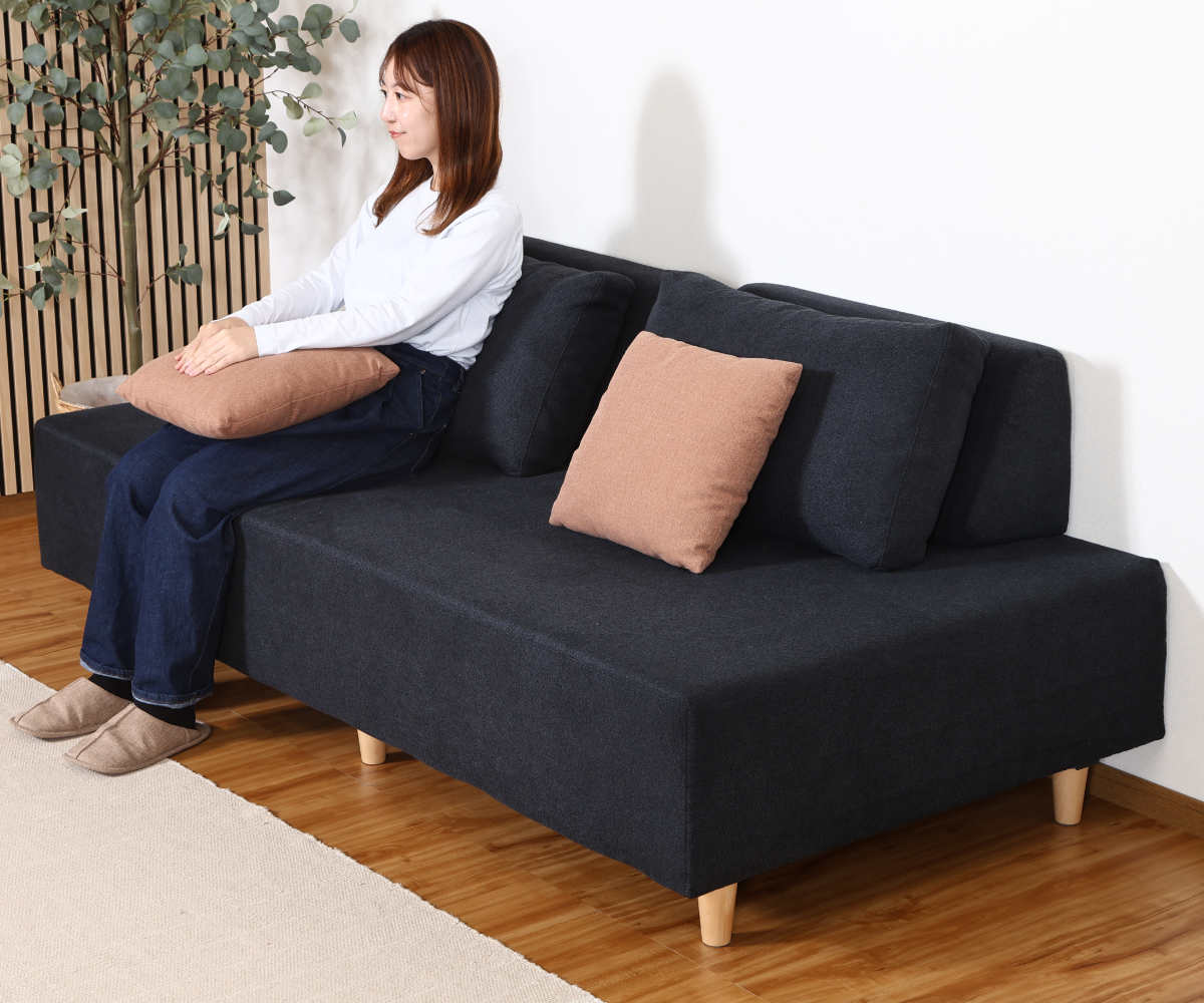 背もたれを移動させることで、座る・脚を伸ばす・横になるなど、シーンに合わせたくつろぎ方が楽しめます。ソファとしてはもちろん、フラットに近い状態でゆったり過ごせるのも魅力です。
