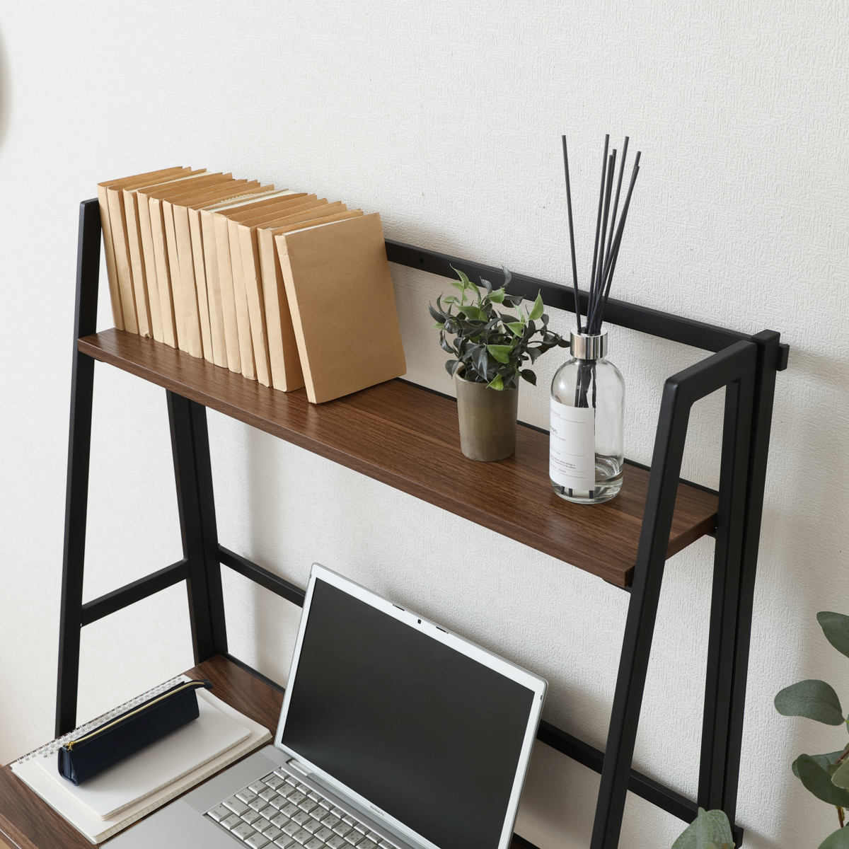 天板の上には収納棚が付いているので、好きなものをディスプレイして楽しんだり、本や資料を置いておけば必要な時にサッと手に取ることができます。