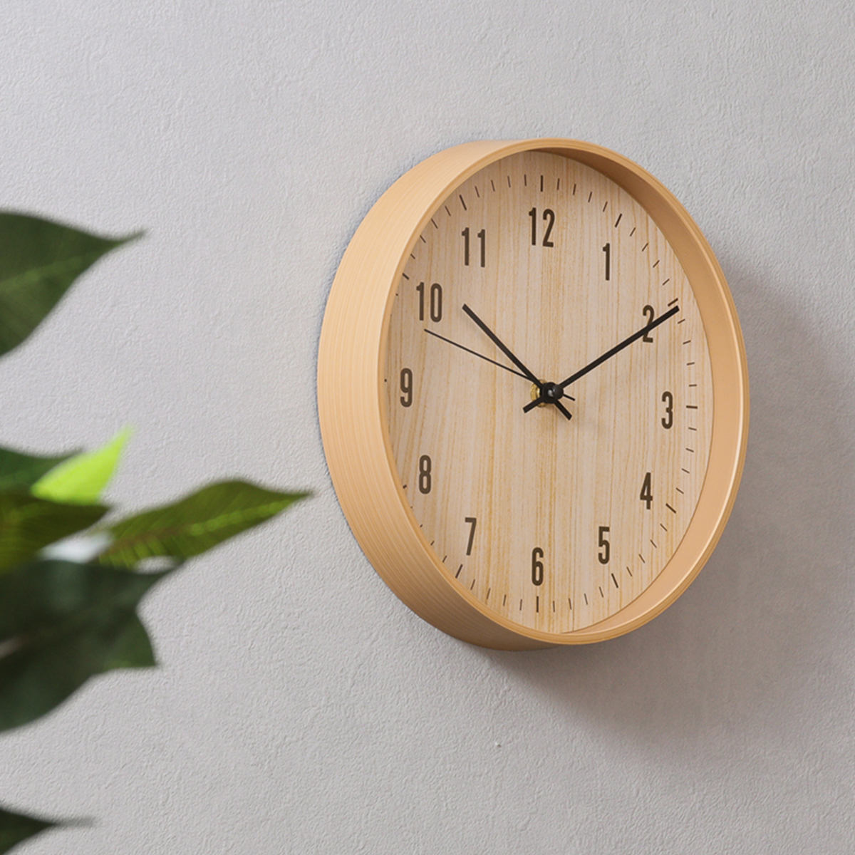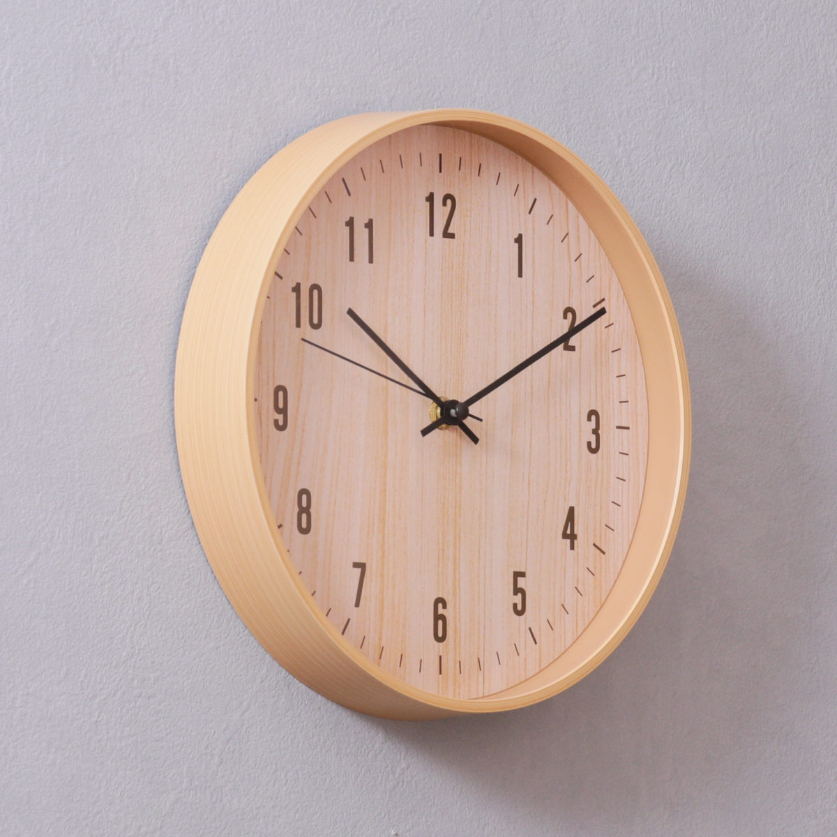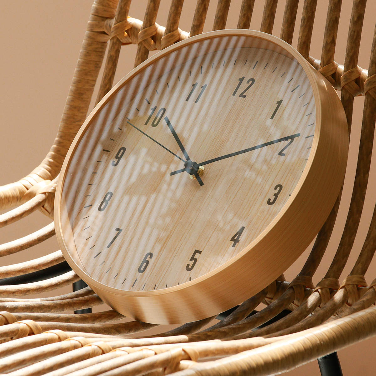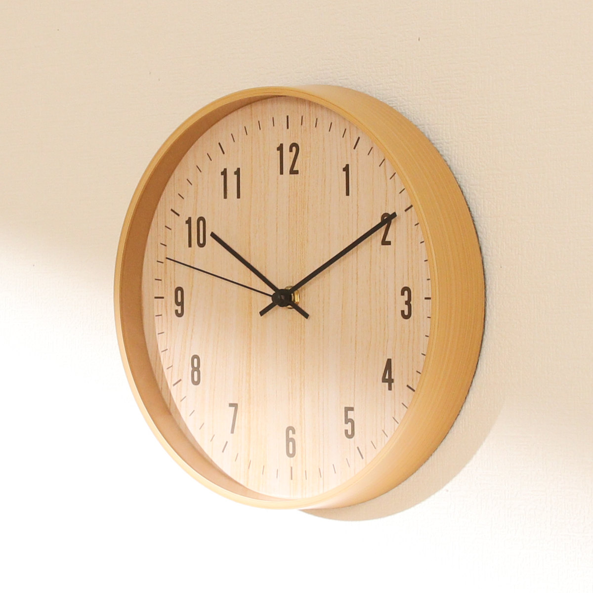 樹脂製のフレームに木目のフィルムをプリントし、 まるで天然木のようなやさしい風合いに仕上げました。 ナチュラルテイストや北欧インテリアに合う掛け時計です。
