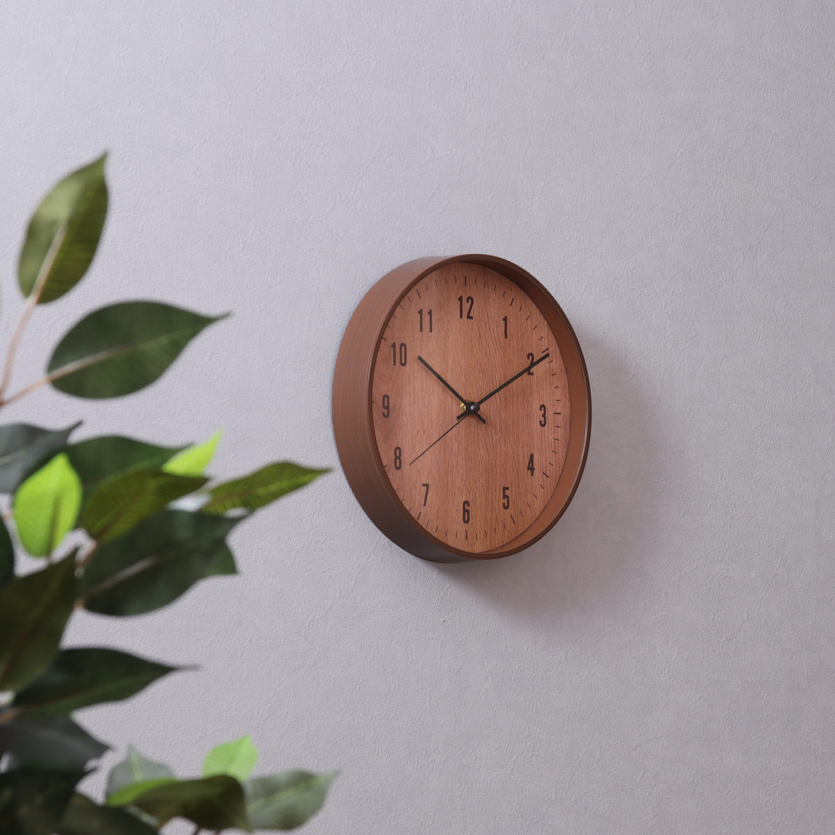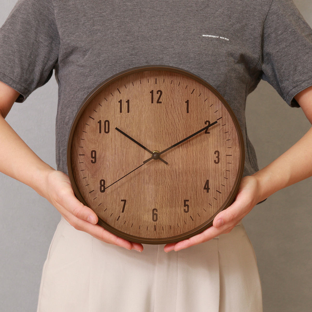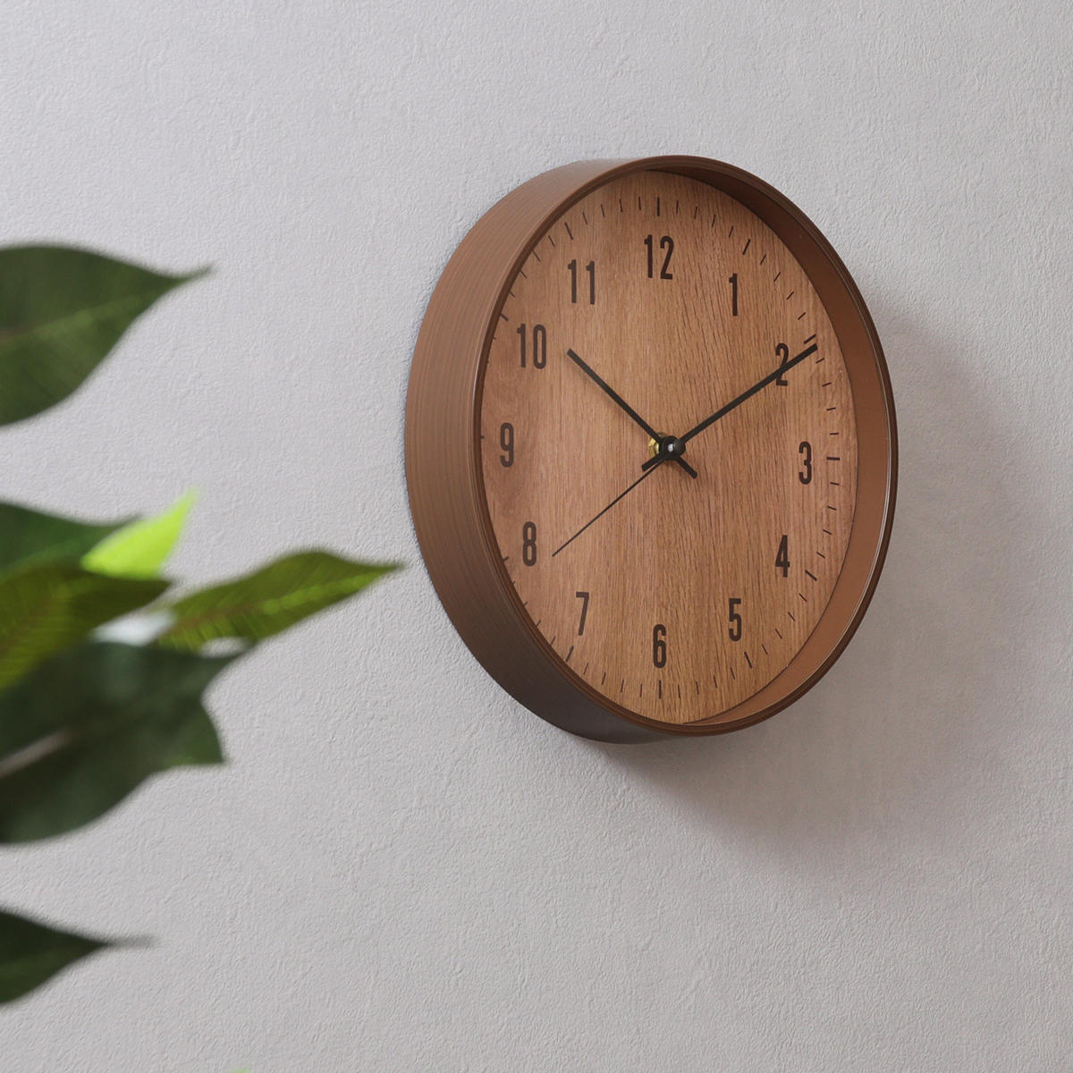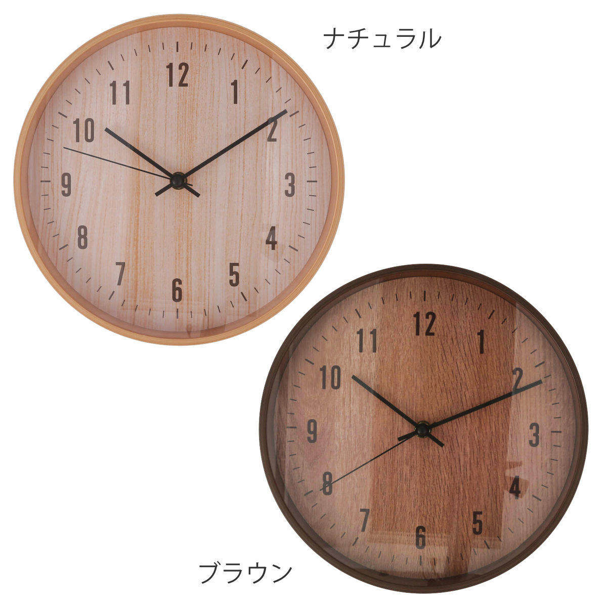 樹脂製のフレームに木目のフィルムをプリントし、 まるで天然木のようなやさしい風合いに仕上げました。 ナチュラルテイストや北欧インテリアに合う掛け時計です。