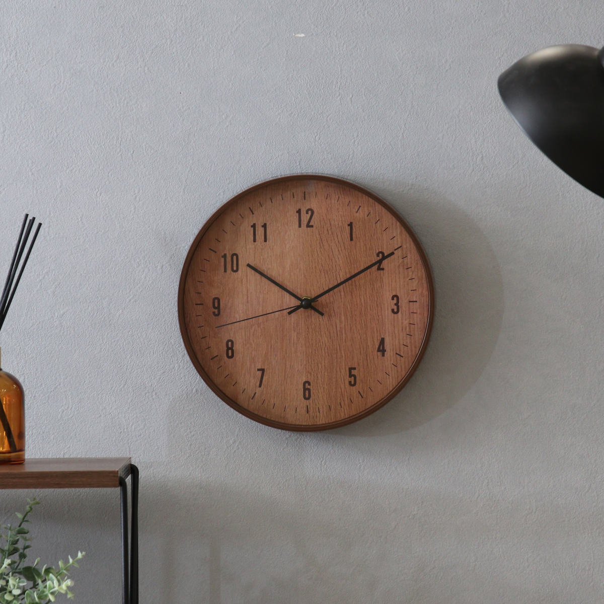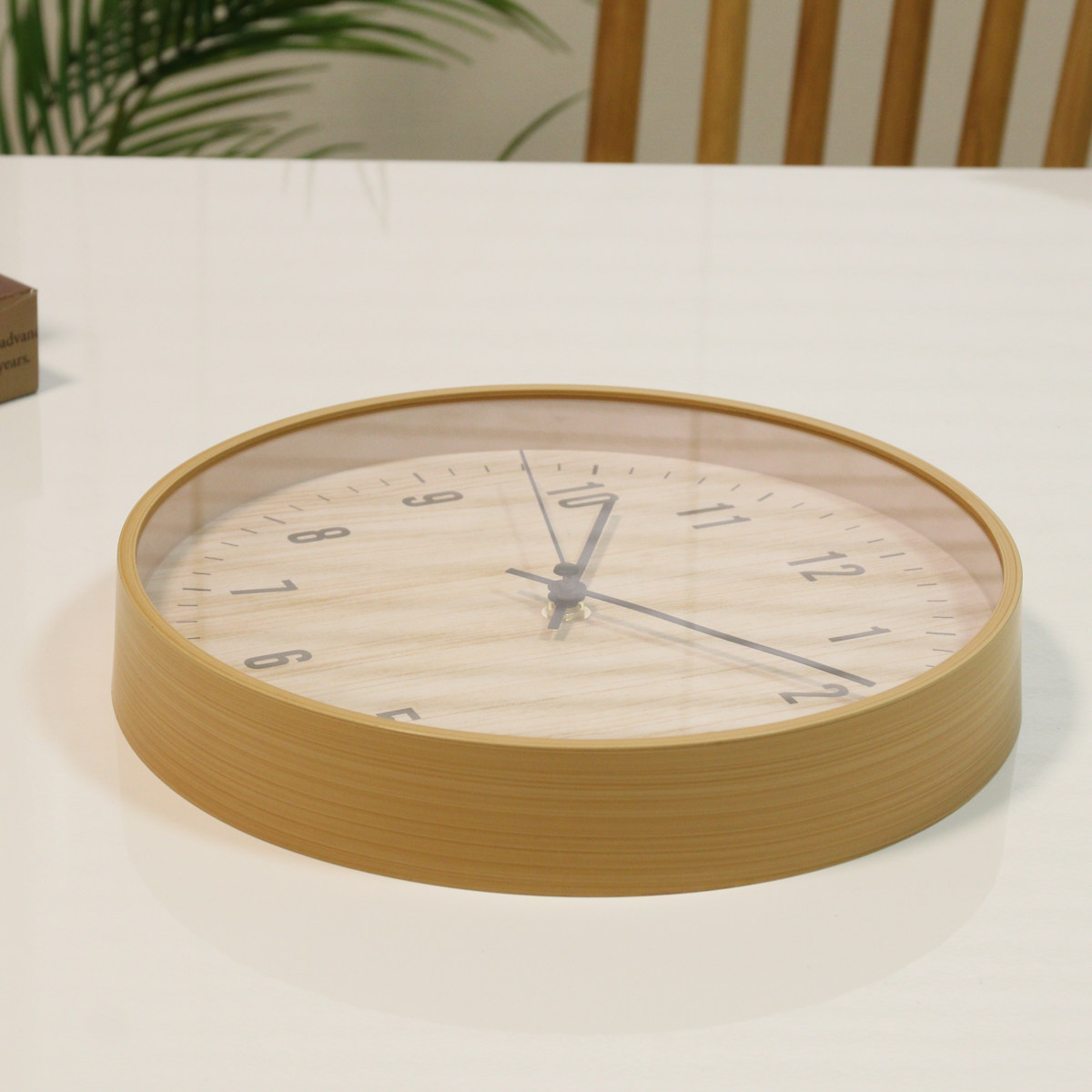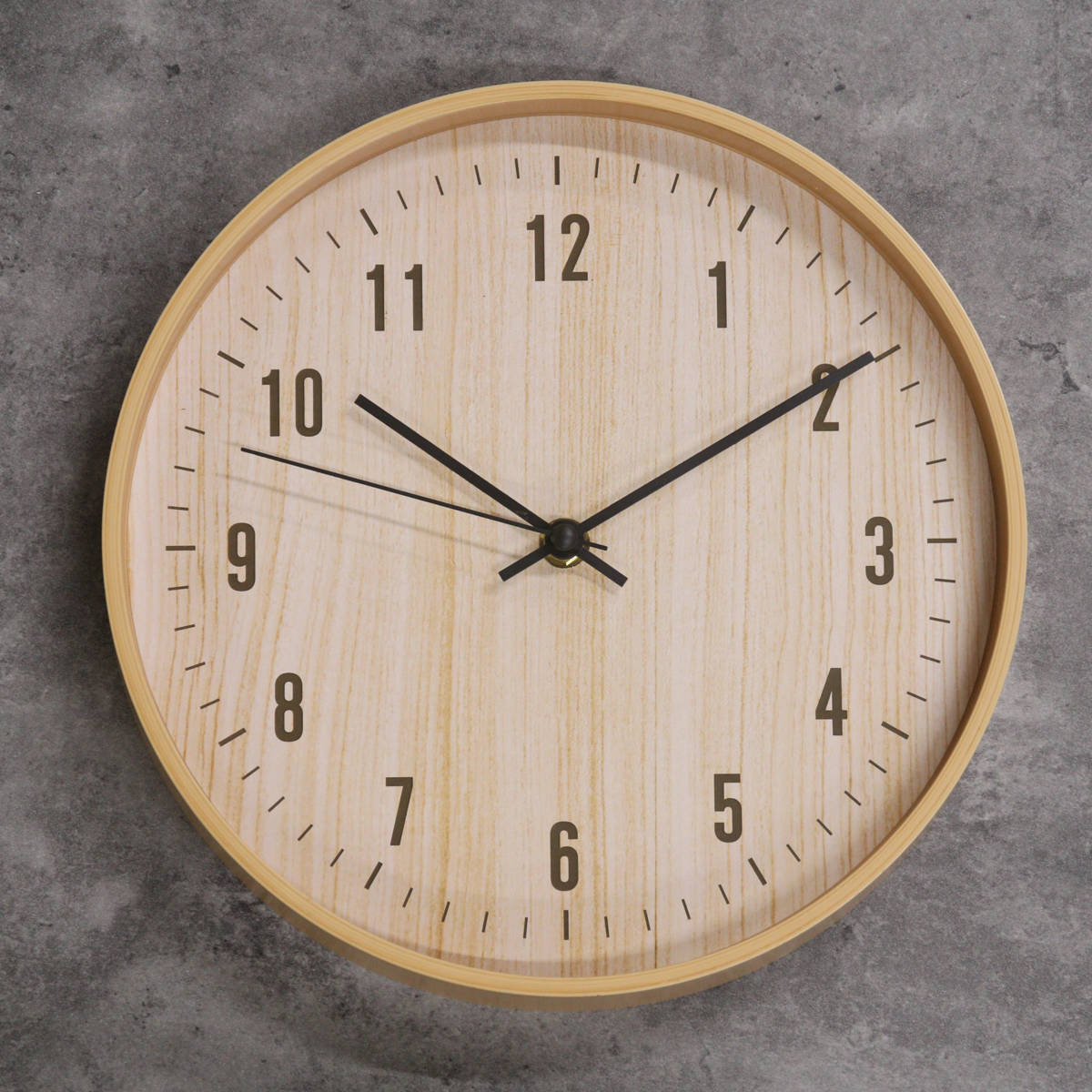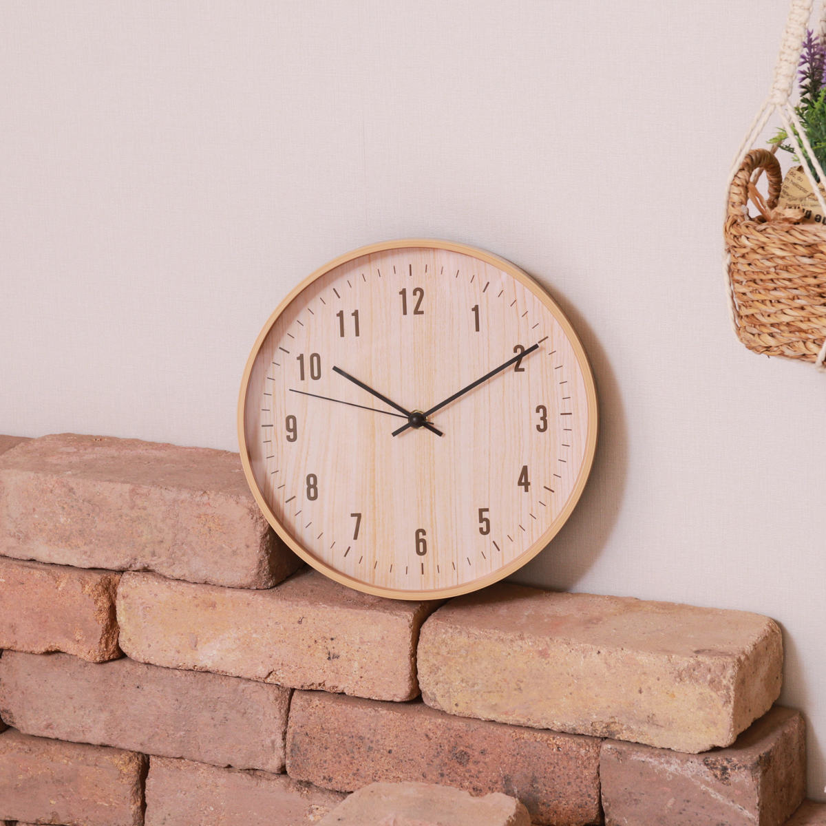 樹脂製のフレームに木目のフィルムをプリントし、 まるで天然木のようなやさしい風合いに仕上げました。 ナチュラルテイストや北欧インテリアに合う掛け時計です。