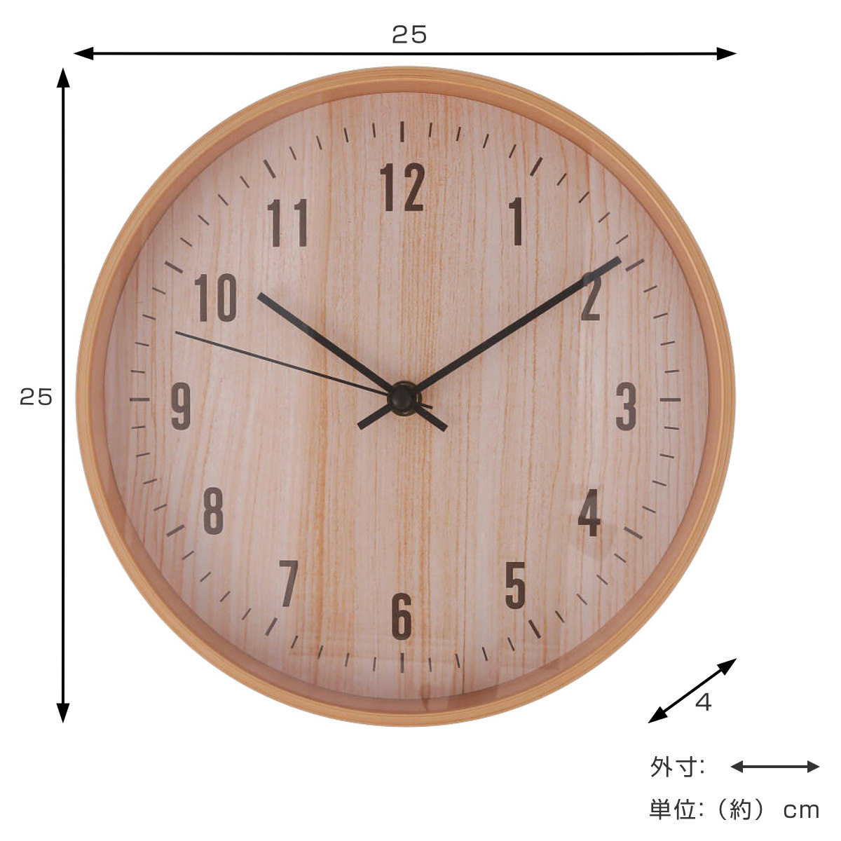 直径25cmの程よいサイズで、 お部屋に圧迫感を与えにくく、遠くからでも見やすい大きさ。 リビングや寝室、ワークスペースにもおすすめです。