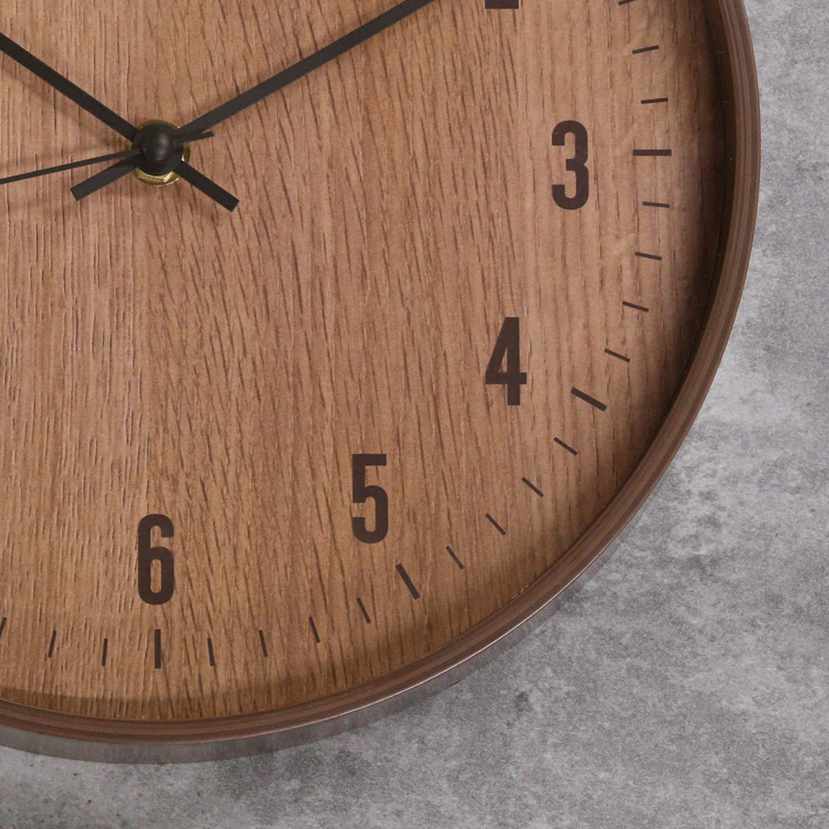 文字盤全体に木目プリントを施し、落ち着いた印象に。 文字はシンプルながら時間をひと目で確認しやすいデザインです。