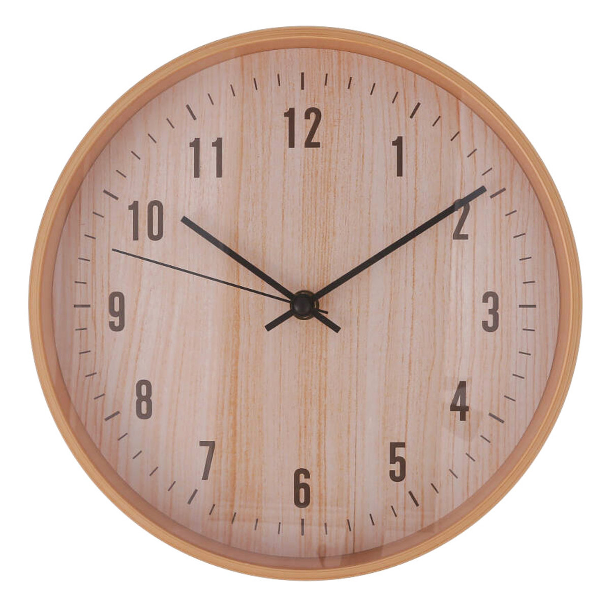 樹脂製のフレームに木目のフィルムをプリントし、 まるで天然木のようなやさしい風合いに仕上げました。 ナチュラルテイストや北欧インテリアに合う掛け時計です。