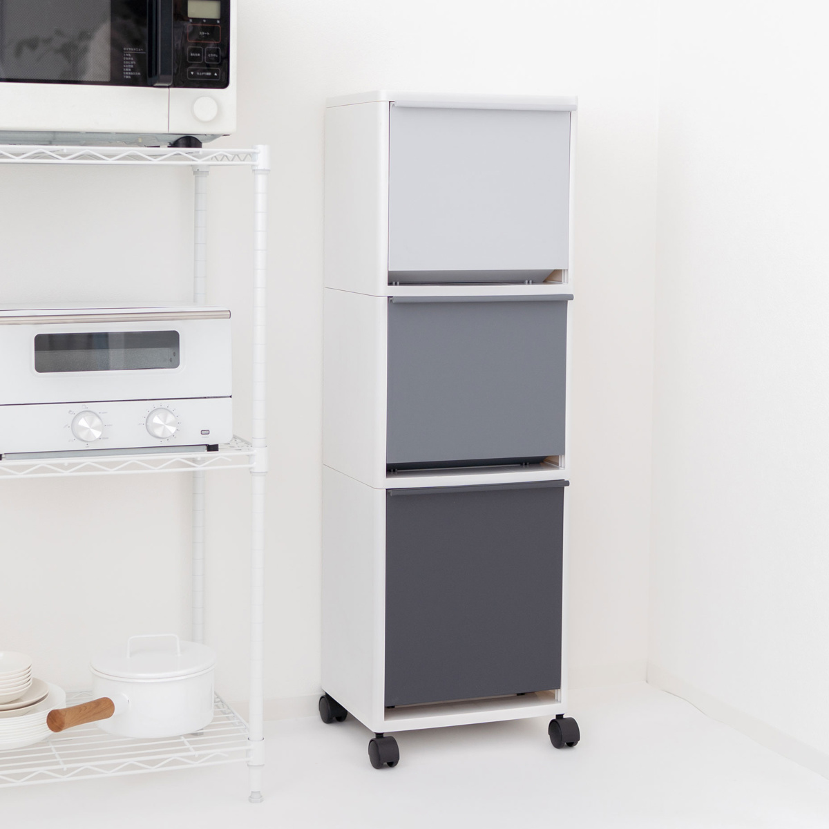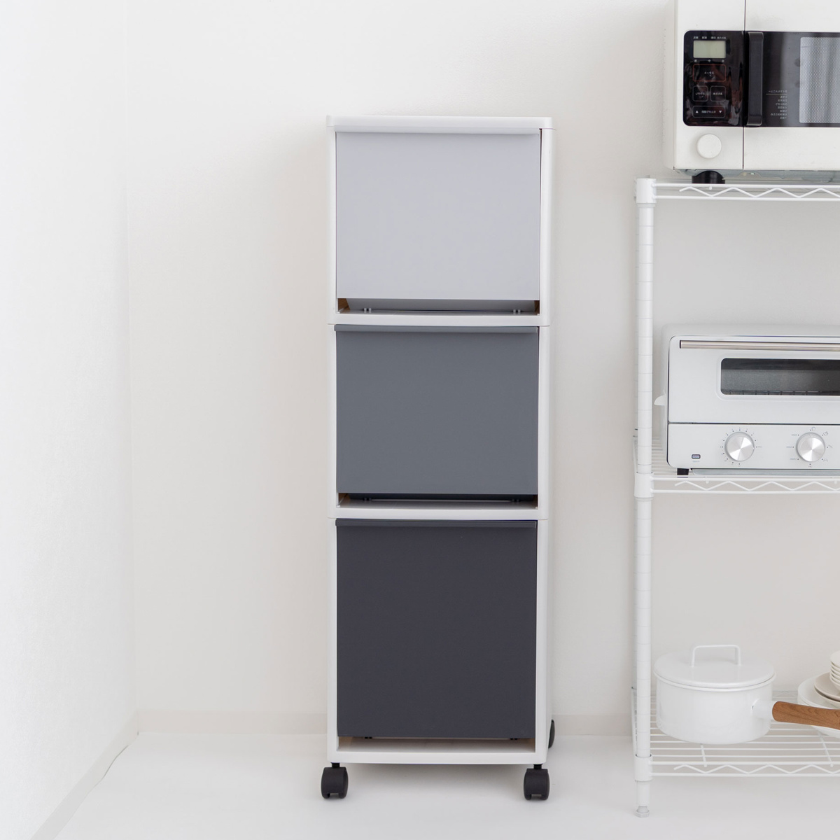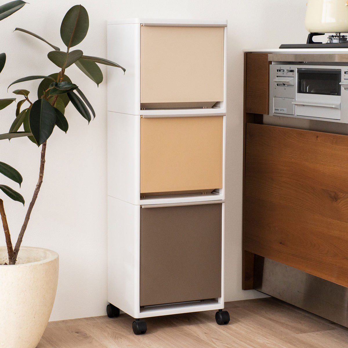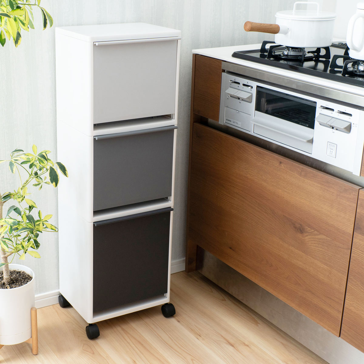 高さ99cmの縦型3段ゴミ箱は、スリムながら高さを活かしてたっぷり収納できます。上段・中段はそれぞれ12.5L、下段は18Lで、合計43Lの容量を確保。深さのある下段には、ワインボトルや背の高いペットボトルもスッキリ収まります。