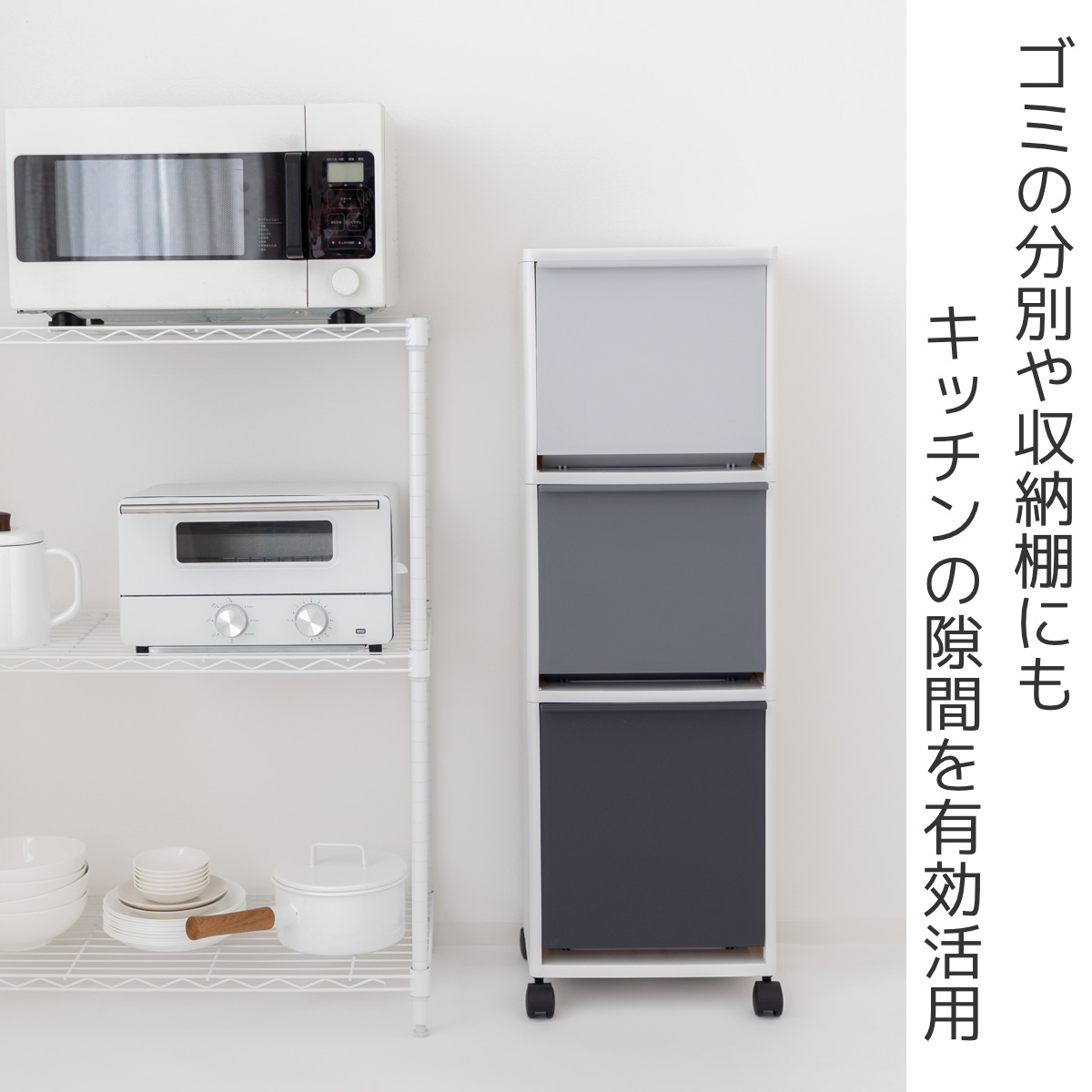 キッチンの空間を有効に使える幅約33.5cmのスリムなダストボックスです。冷蔵庫・シンク・食器棚横などのキッチンのデッドスペースに設置できて、ペットボトル・缶などのかさばる資源ゴミもひとまとめにできます。