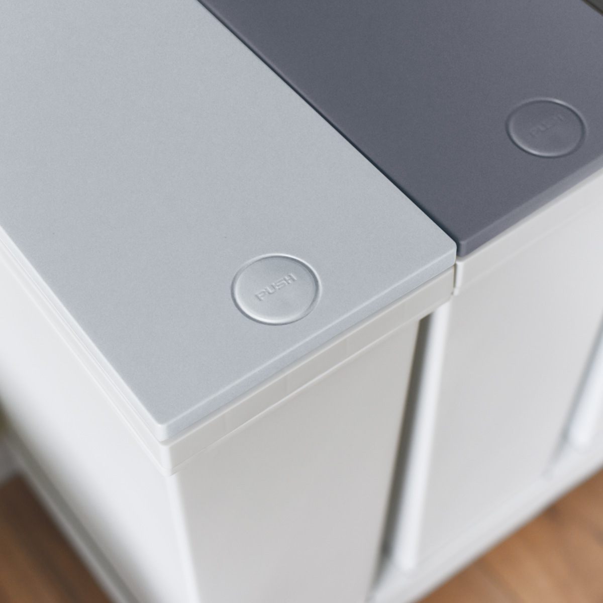 ふたは片手で簡単に開けられるワンプッシュ式です。「PUSH」と書いてある部分を押すとふたが開きます。ふたを開けっ放しにもできるので便利です。