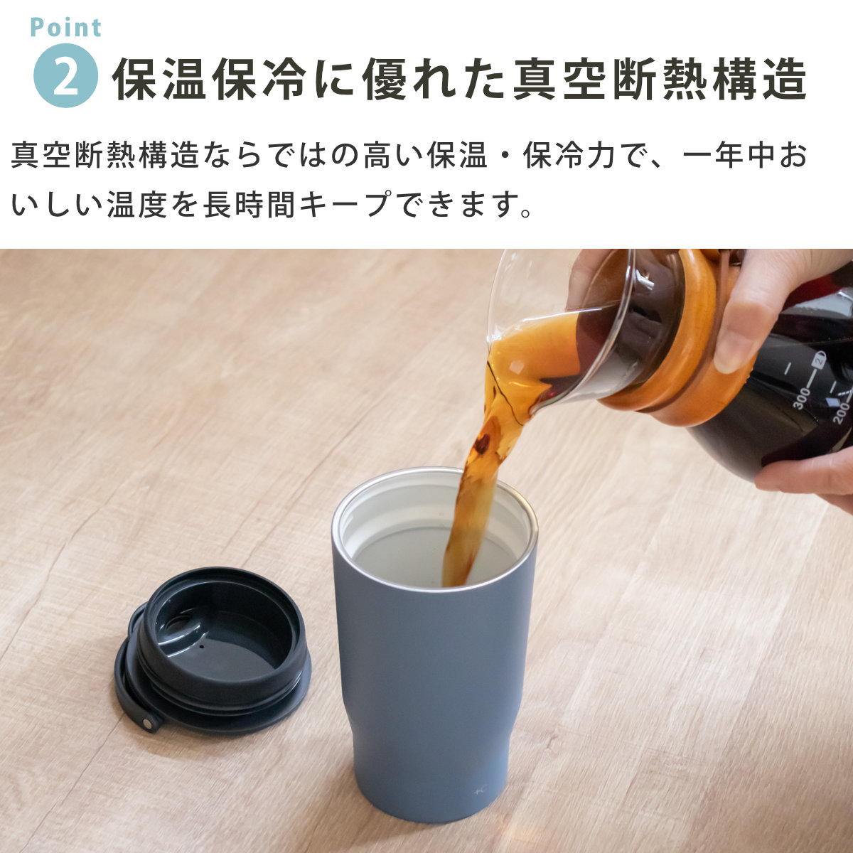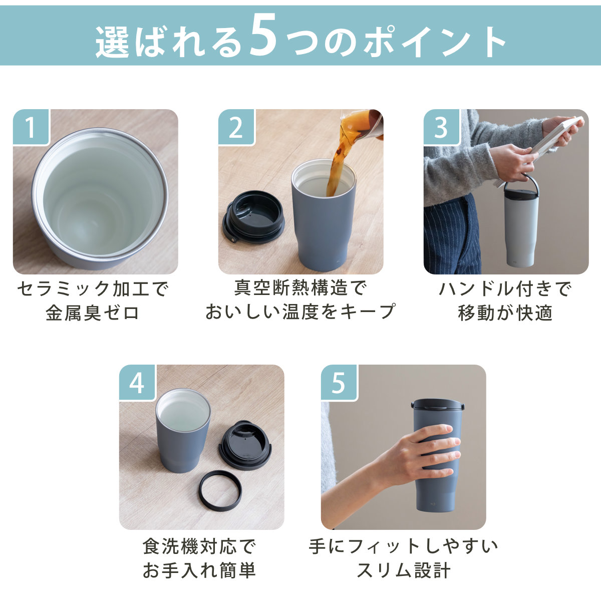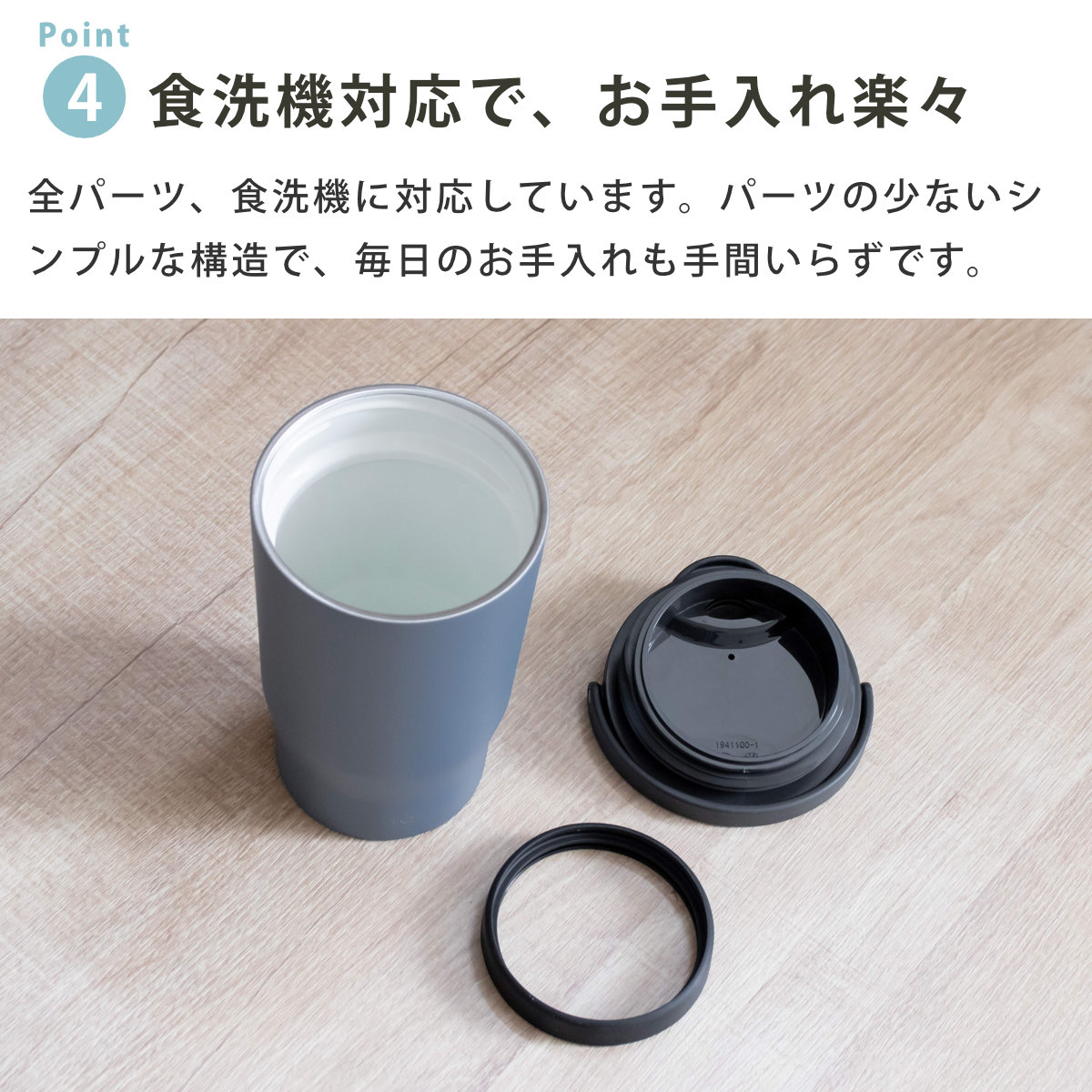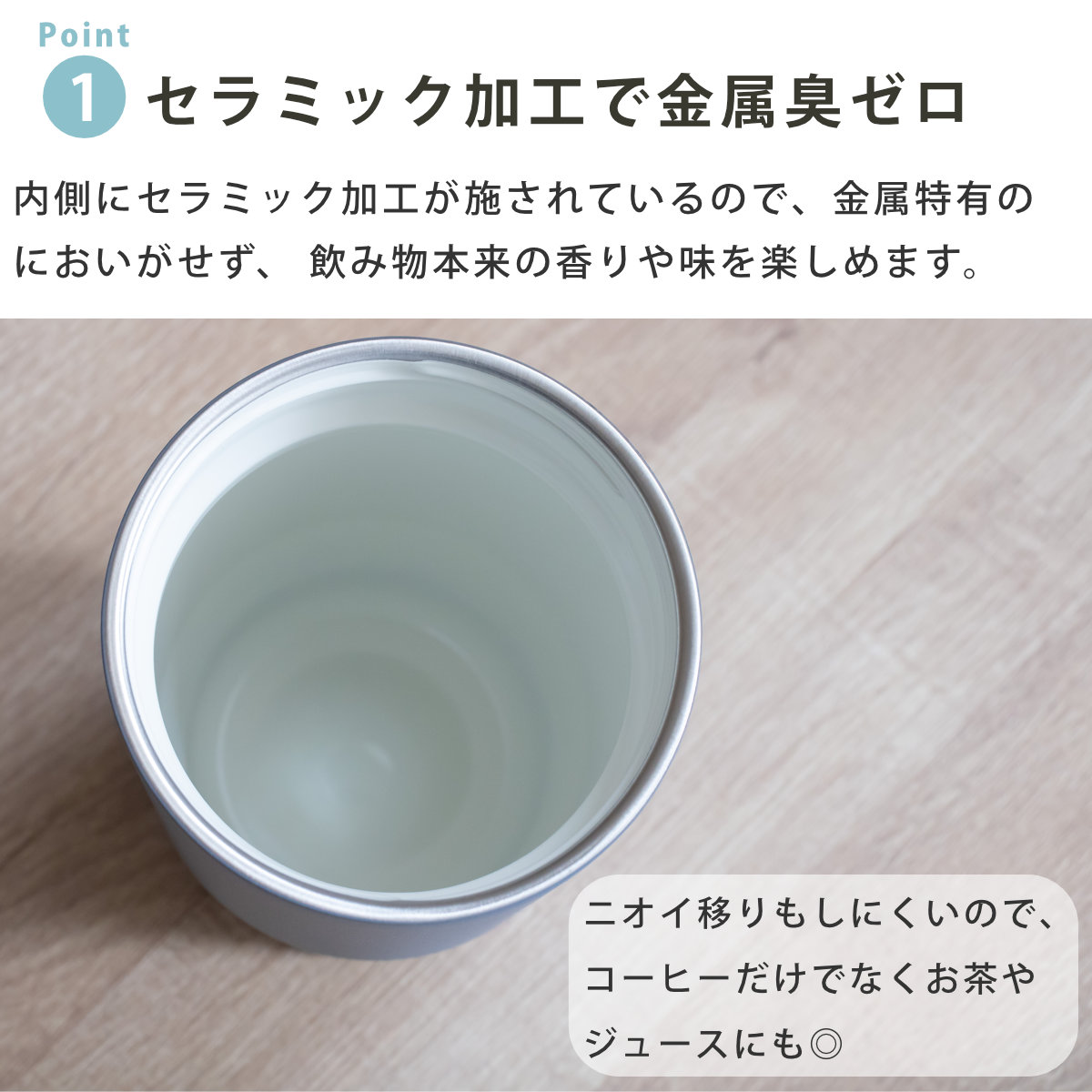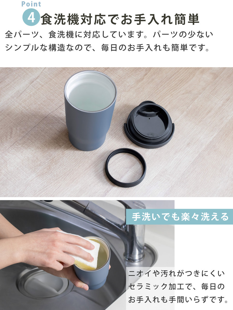 | 材質 | フタ:PBT/ABS樹脂(上フタ)、ポリプロピレン(下フタ・ハンドル)、シリコーンゴム(飲み口パッキン)、ステンレス鋼(軸) フタパッキン:シリコーンゴム 本体容器(内瓶):ステンレス鋼(セラミックコーティング) 本体容器(胴部):ステンレス鋼(ポリエステル樹脂塗装) |