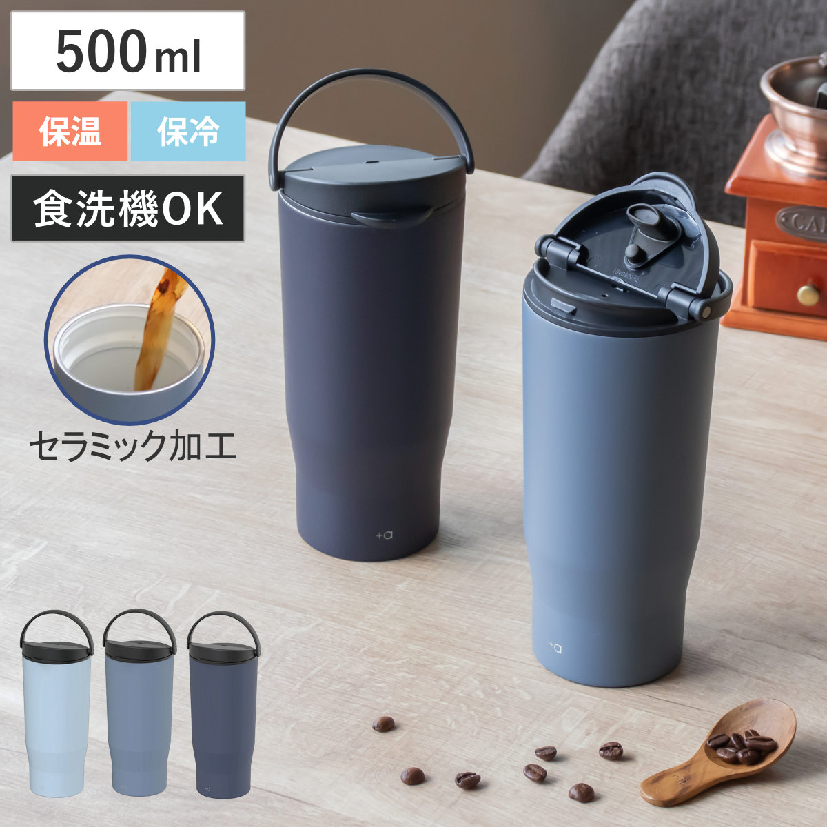 ハンドル付きコーヒータンブラー 500ml プラスエー ( ステンレスタンブラー 保温 保冷 食洗機対応 ステンレス製 カップ コップ 食洗機OK 洗いやすい ハンドル付 真空断熱 シンプル おしゃれ コーヒー 珈琲 紅茶 散歩 ふた付 ) 【ライトブルー】