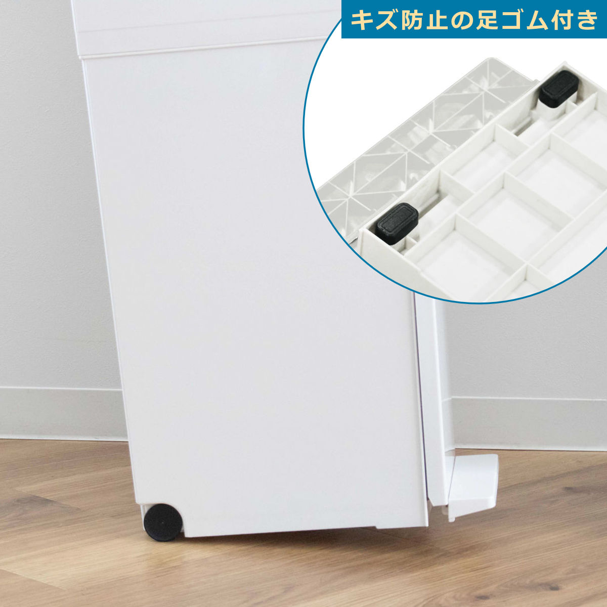 背面のキャスターで、掃除やゴミ袋交換の際もスムーズに移動。底面の前側には足ゴム付きなので、床を傷つけにくく安心して設置できます。