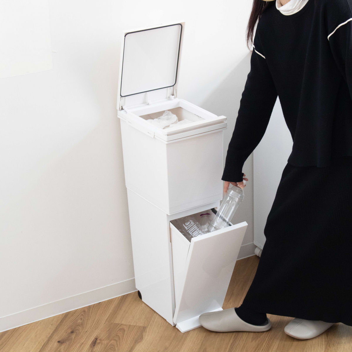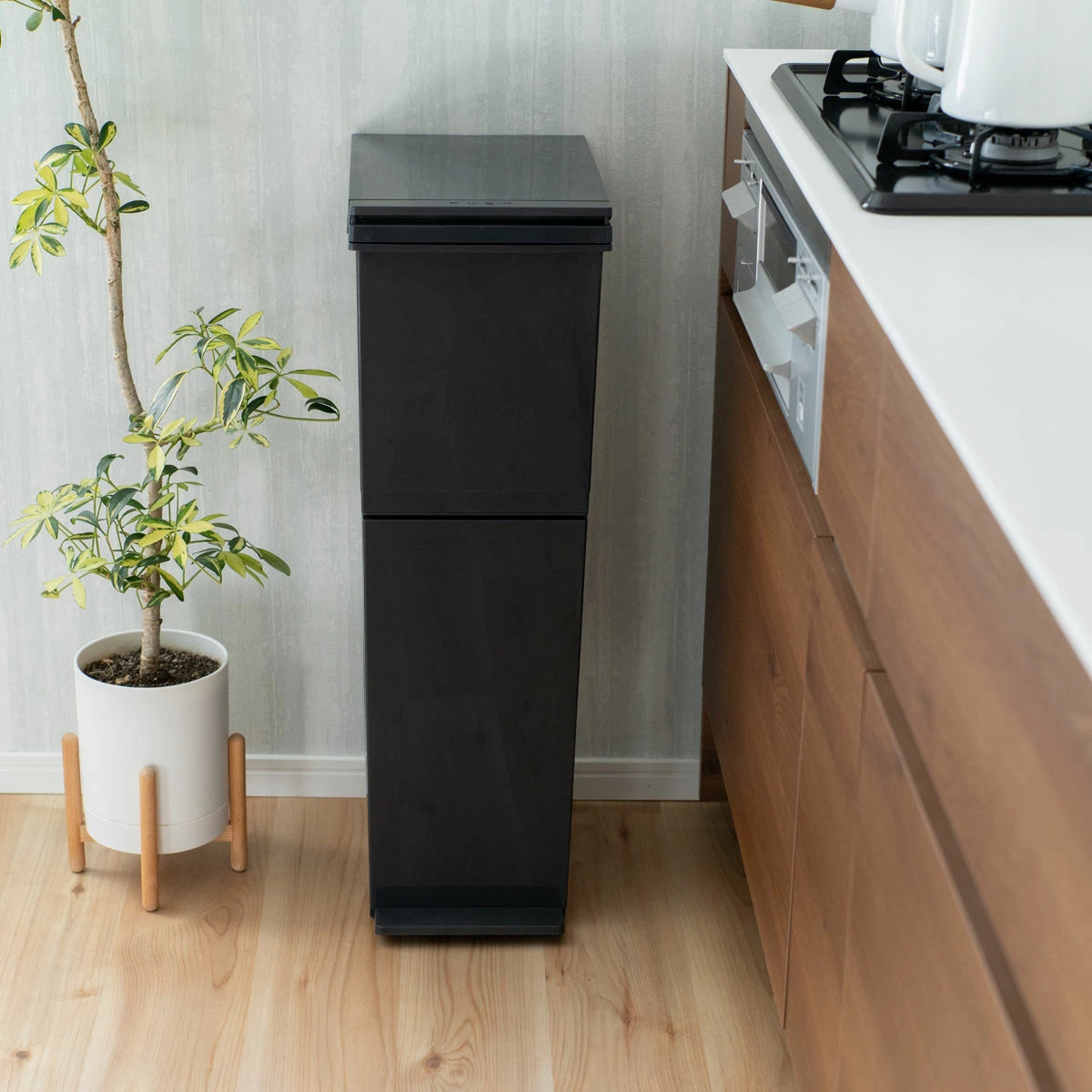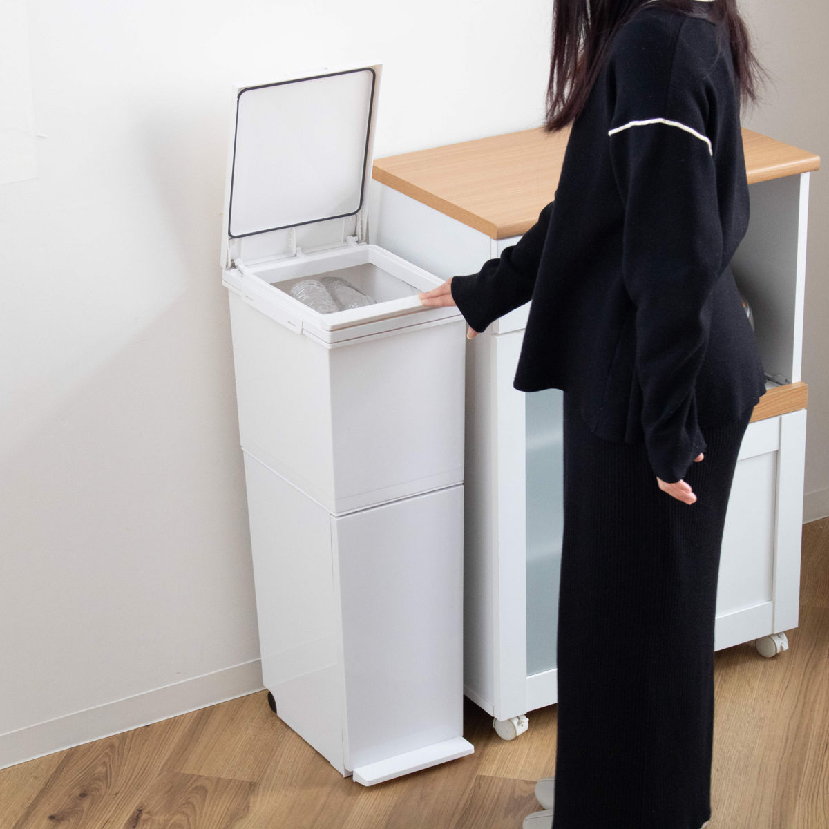 生ゴミと資源ごみを縦型2段でスマートに分別。スリムな幅だから2個並べてもすっきり収まり、缶・ペットボトル・プラごみなど細かな分別にも対応できます。