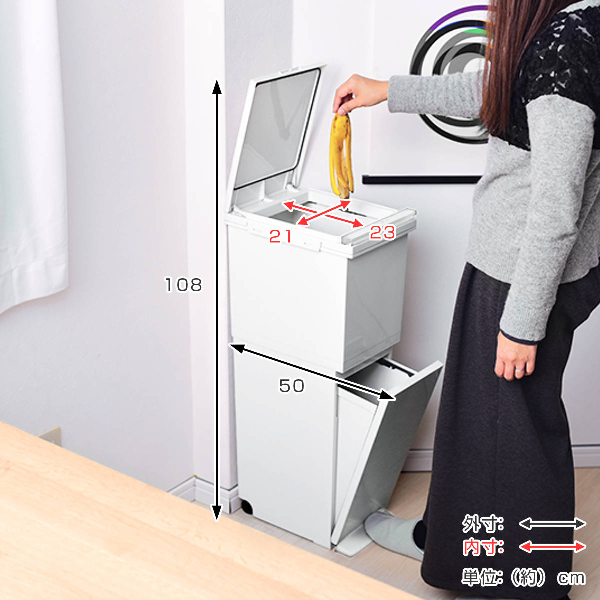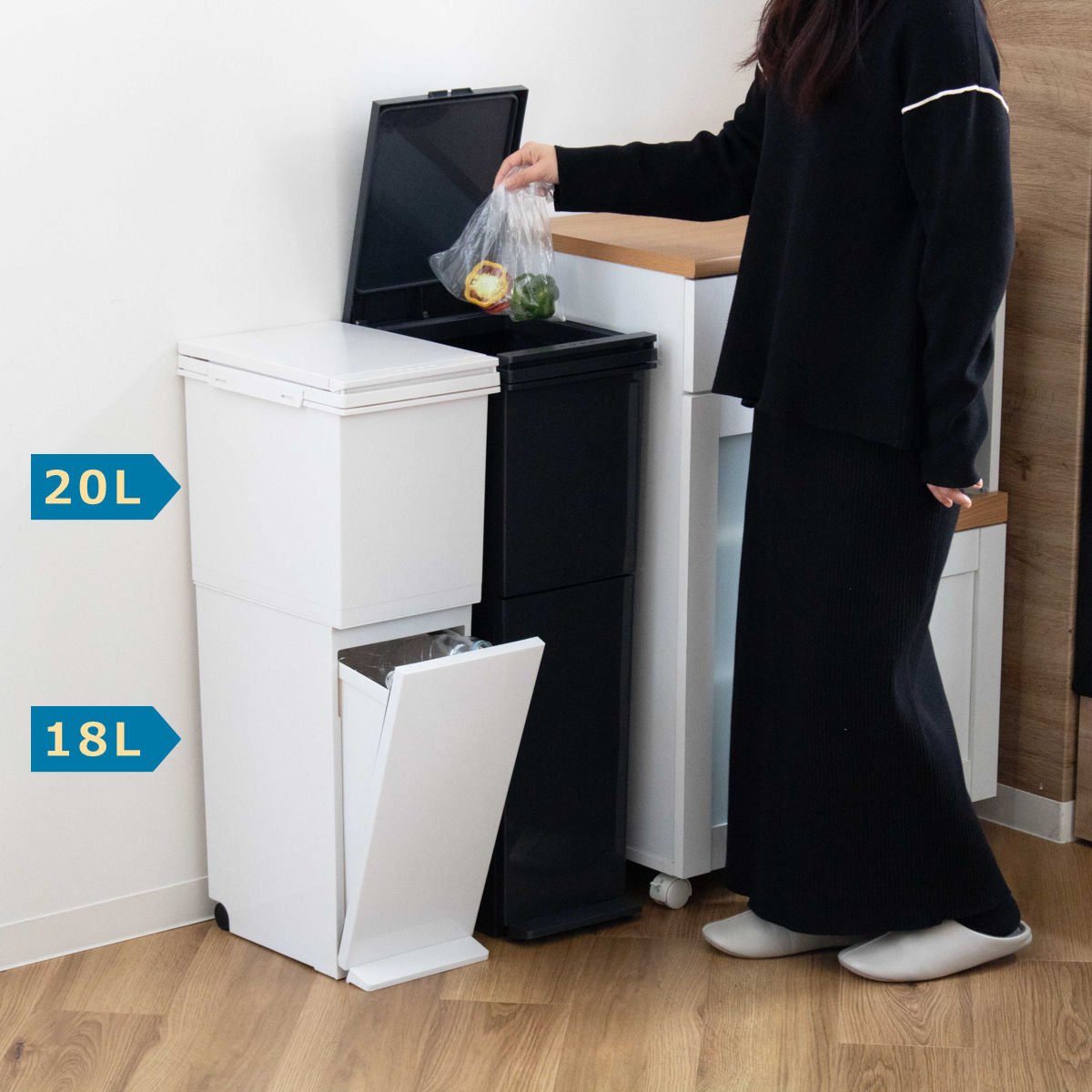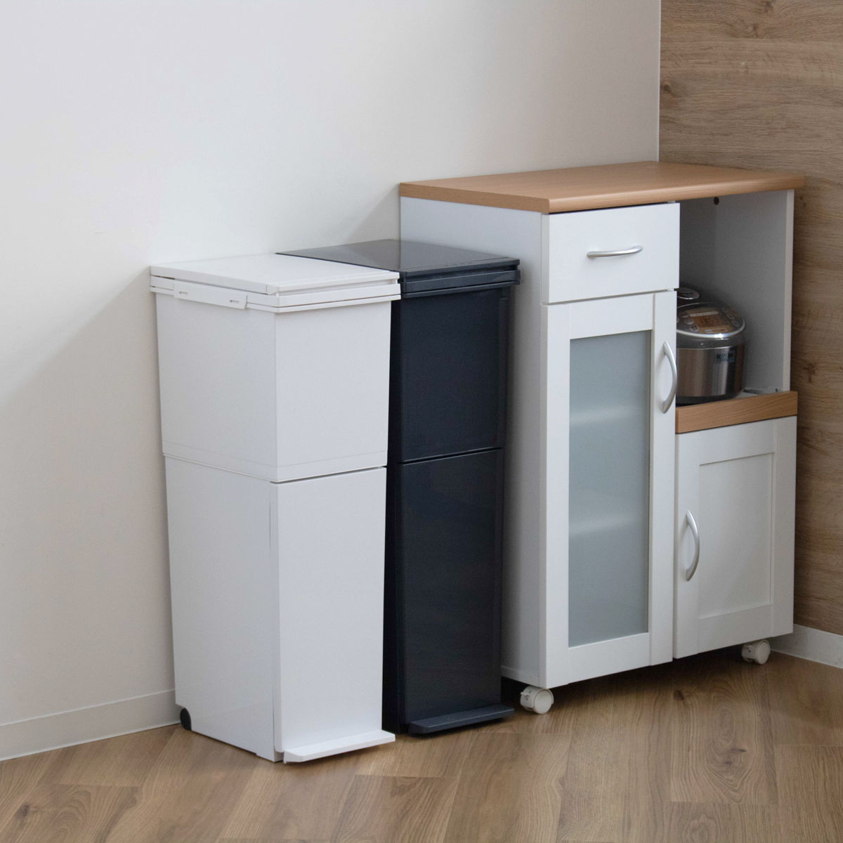 生ゴミと資源ごみを縦型2段でスマートに分別。スリムな幅だから2個並べてもすっきり収まり、缶・ペットボトル・プラごみなど細かな分別にも対応できます。