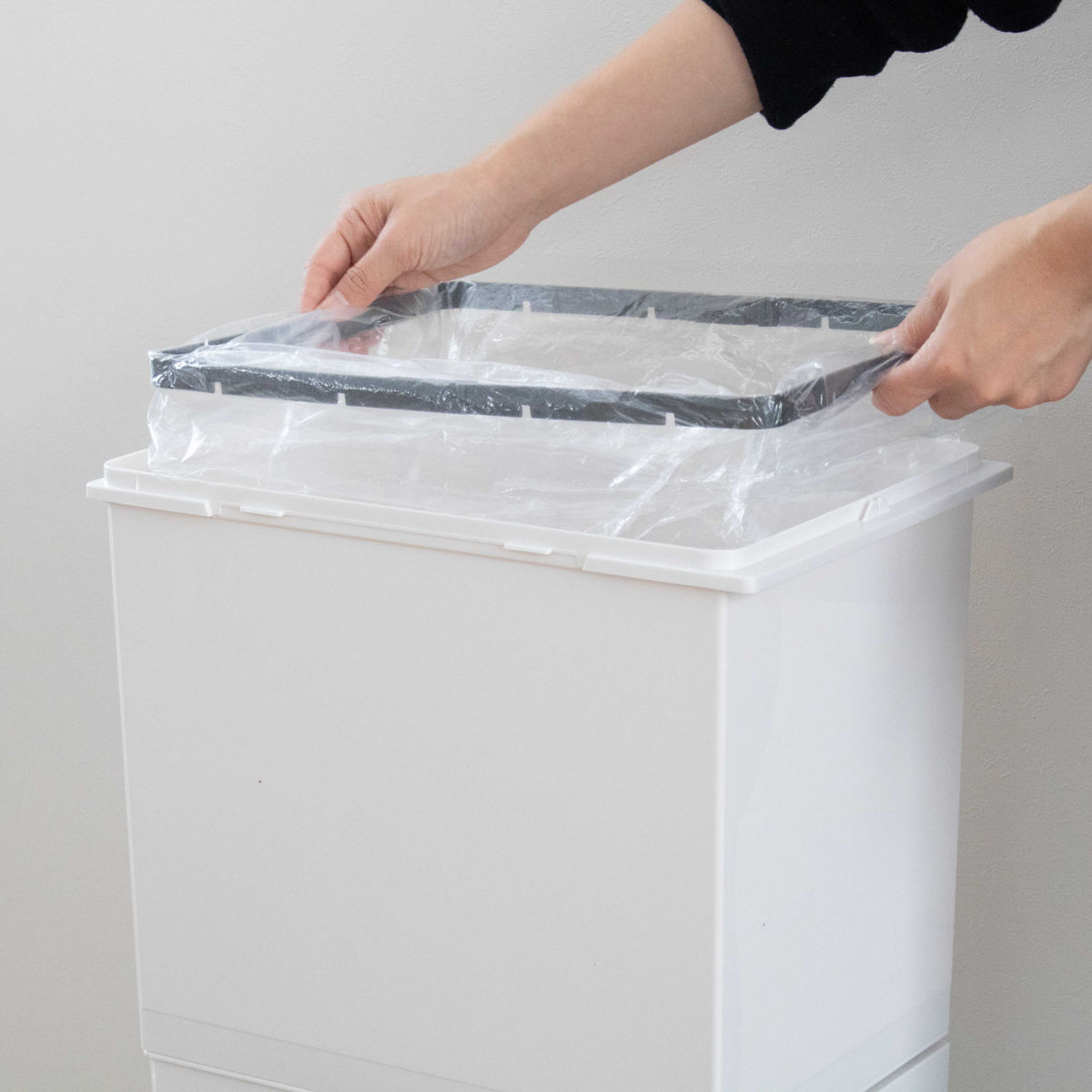 本体に付属の袋止めフレームを使って、ゴミ袋をしっかり固定できます。袋の端を内側に入れ込むだけなので簡単、袋がはみ出さず生活感をオフできます。
