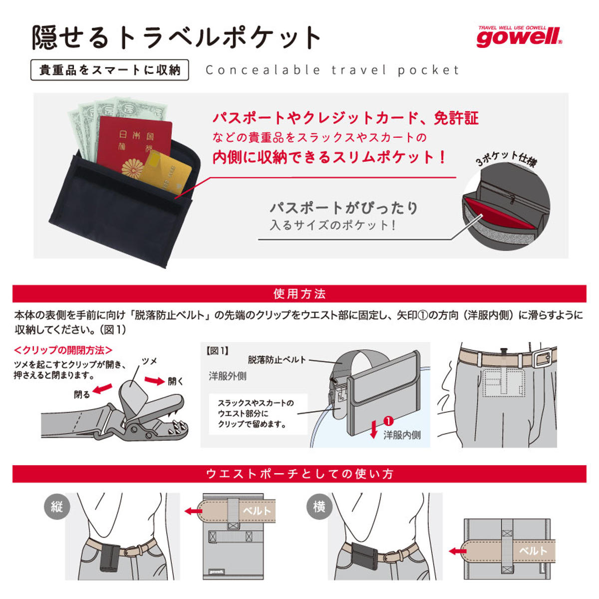 ズボンやスカートの内側に付ける隠しポケットです。パスポートやクレジットカードなどの貴重品をスマートに収納できます。