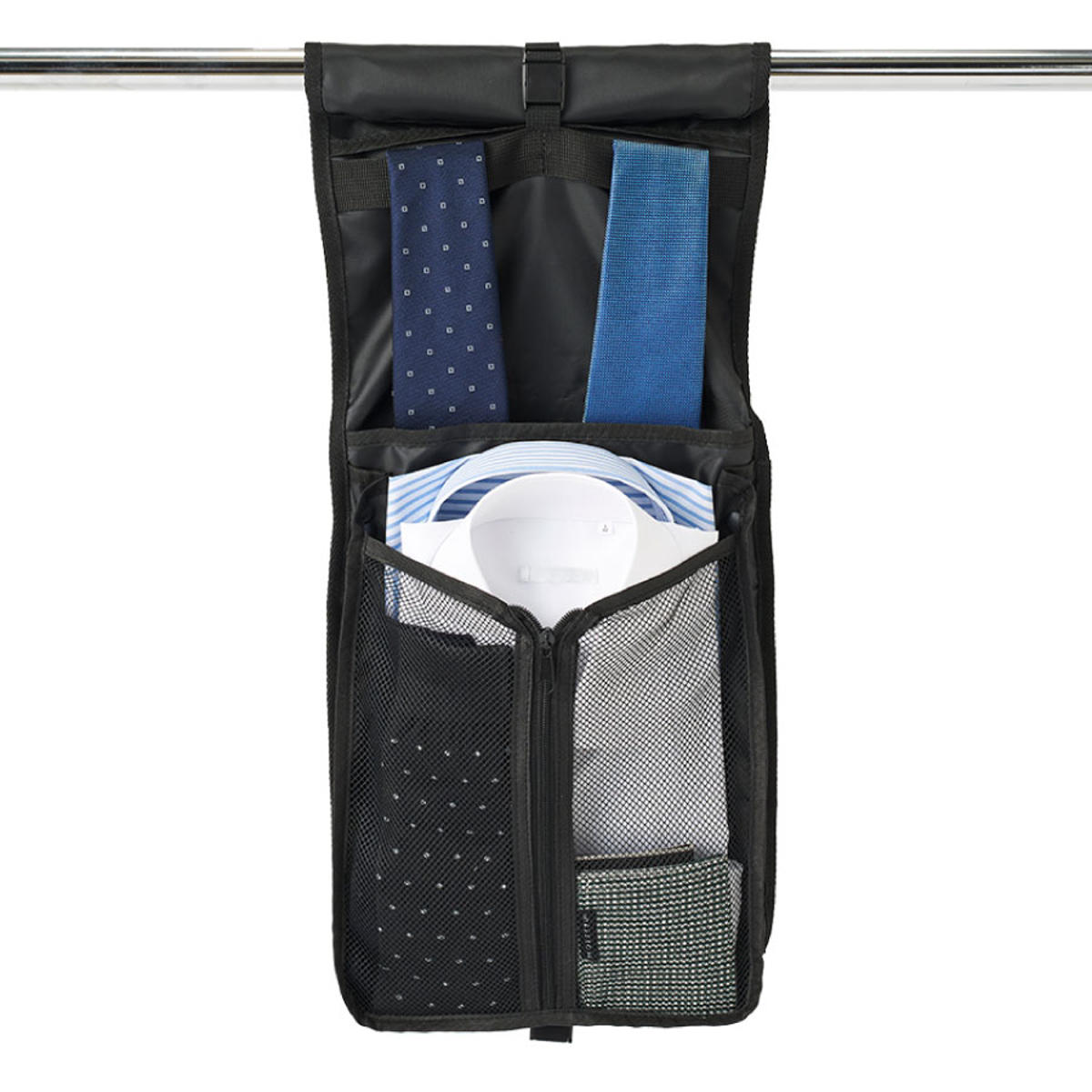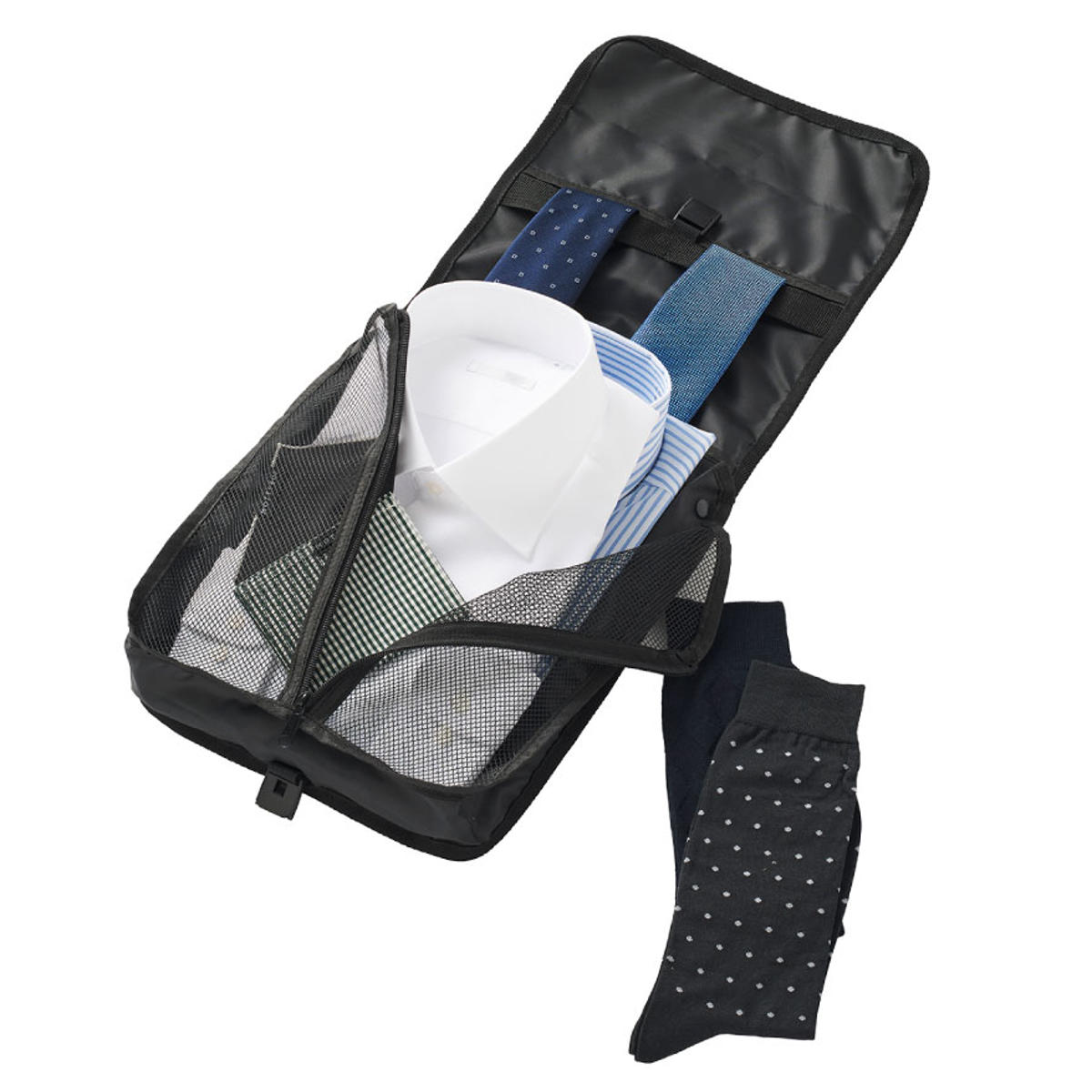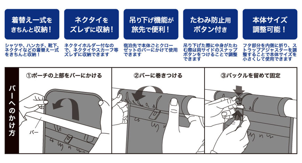 シャツ・ハンカチ・靴下・ネクタイなどの着替え一式をまとめてスッキリ収納できるお着替えポーチ。ネクタイホルダー付きで、出張におすすめです。