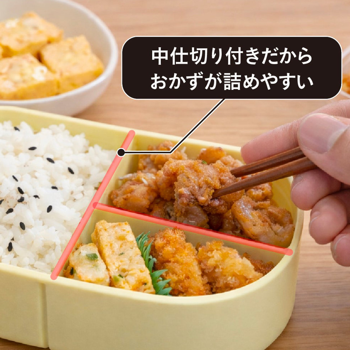 中仕切りが付いているため、おかずの配置に悩まず、バランスよく詰められます。忙しい朝でも、スムーズにお弁当作りができます。