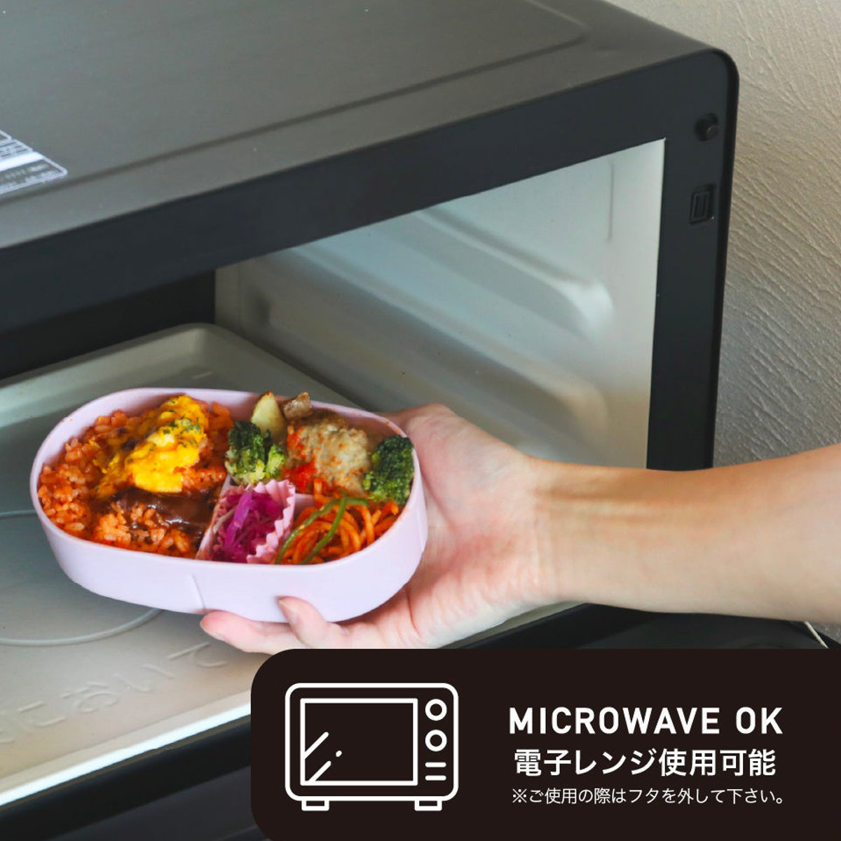 フタを外すと電子レンジにも対応。電子レンジのある職場や学校なら、ランチタイムに温かいお弁当を楽しめます。