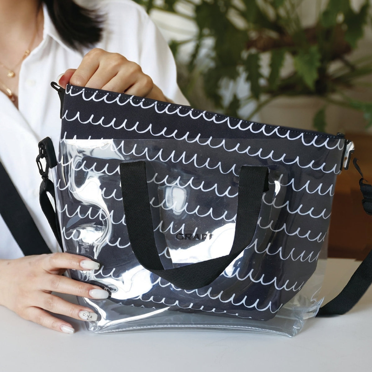 外側は抜け感のあるクリアバッグ、内側には保冷機能付きのインナーポーチをセットにした2WAY仕様のバッグです。