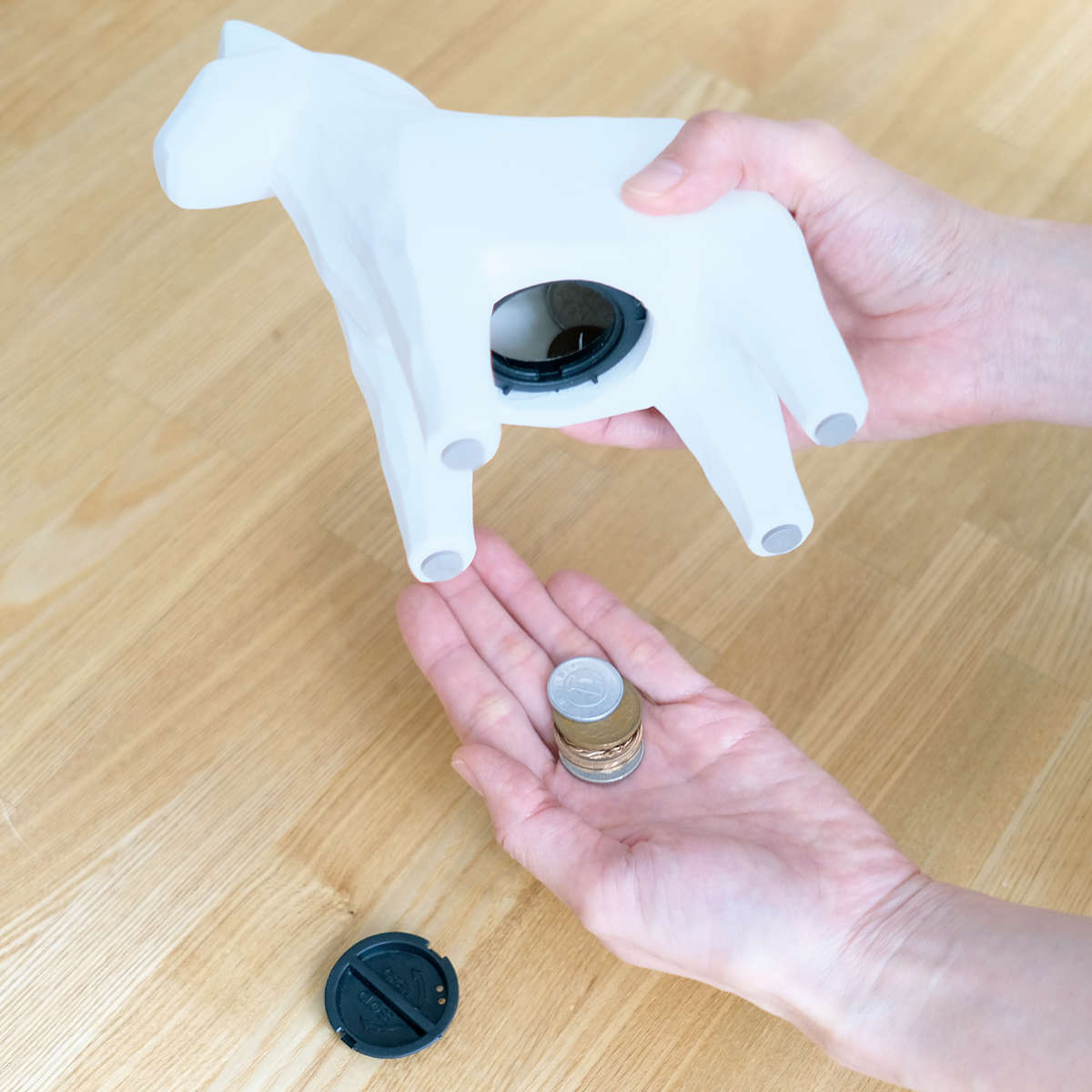 お金は背面から入れられ、底面から取り出せる便利な構造。500円玉で約6万円分貯められるため、楽しみながら無理なく貯金を続けられます。