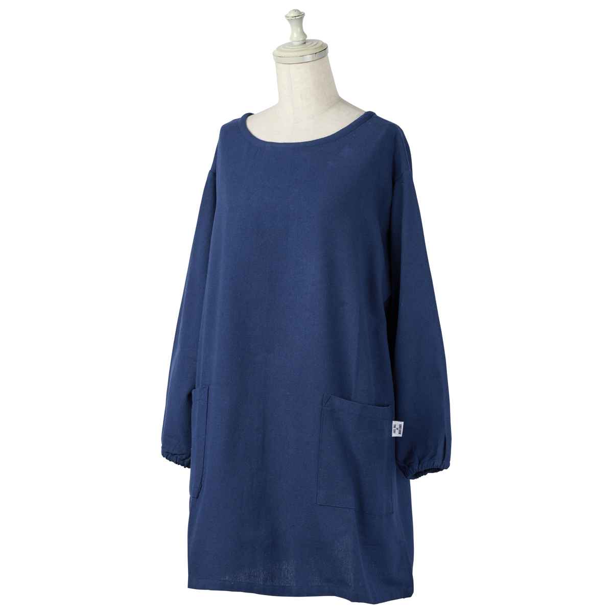 割烹着 イージー カッポウギ リサイクル糸 ( かっぽうぎ エプロン 作業着 台所エプロン 袖付きエプロン ポケット付き おしゃれ ワンピースエプロン 長袖 袖 ゴム 無地 シンプル 大人用 腰ひも レディース サステナブル ) 【ネイビー】