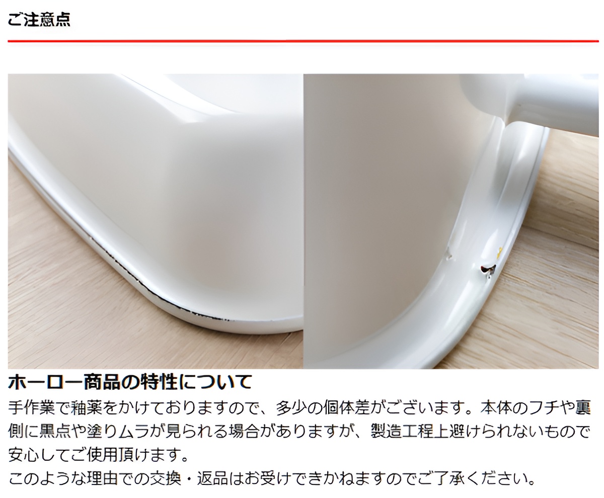 手作業で釉薬をかけておりますので、多少の個体差がございます。本体のフチや裏側に黒点や塗りムラが見られる場合がありますが、製造工程上避けられないもので安心してご使用頂けます。