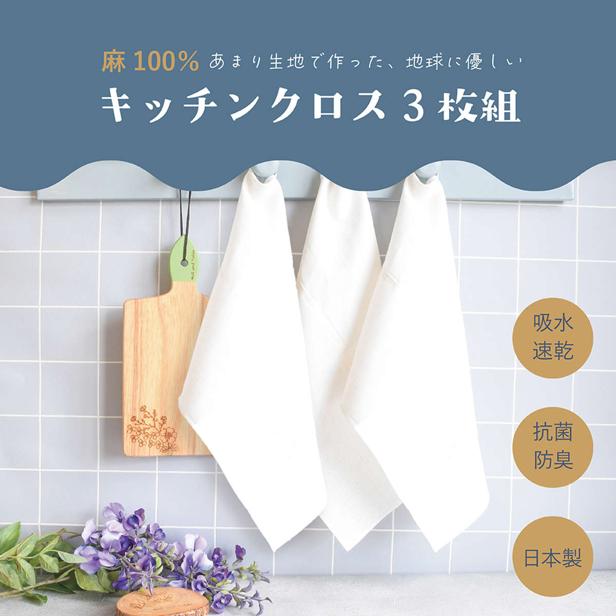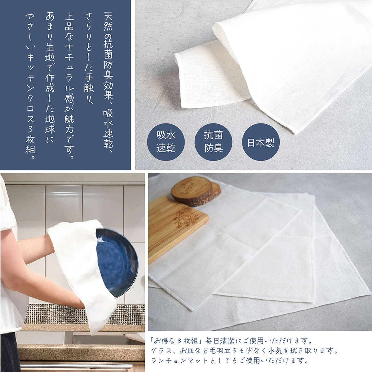 キッチンクロス 3枚組 ( ふきん 布巾 食卓ふきん フキン テーブルふきん 麻 リネン 抗菌 食器拭き 日本製 食器用 台拭き 防臭 吸水 速乾 薄手 あまり生地 地球にやさしい テーブル用 ホワイト )