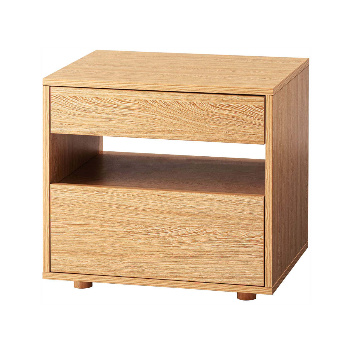 無駄を省いたシンプルなフォルムが魅力のサイドチェストです。すっきりと収納できる2段の引出しで、機能性にも優れています。幅50cm・高さ46cmの程よいサイズ感で、ベッドやソファサイドの収納として活躍します。