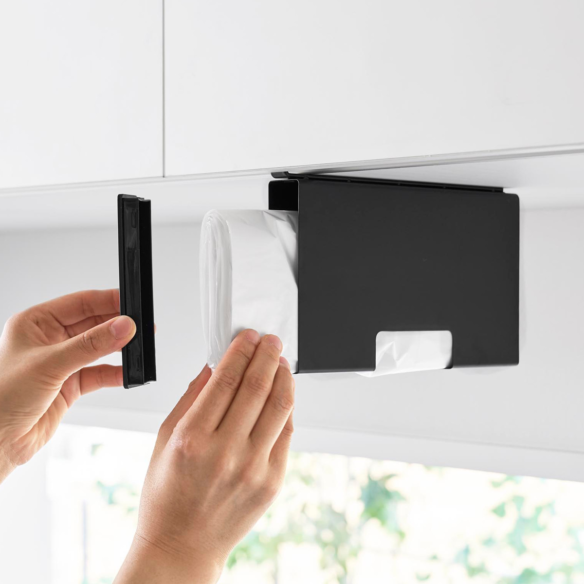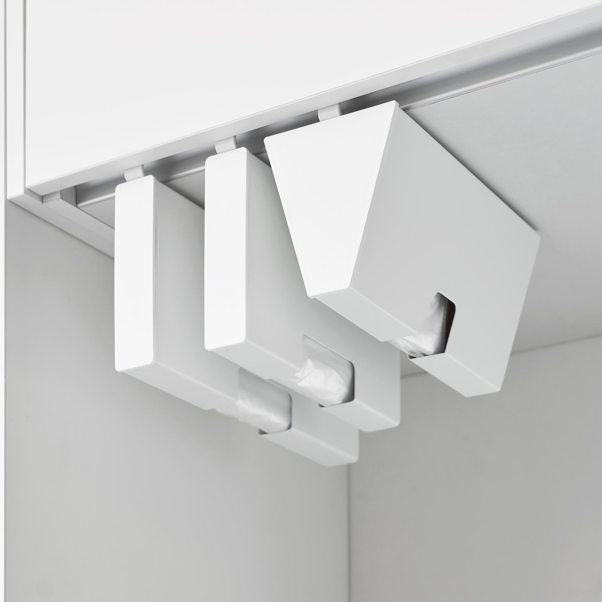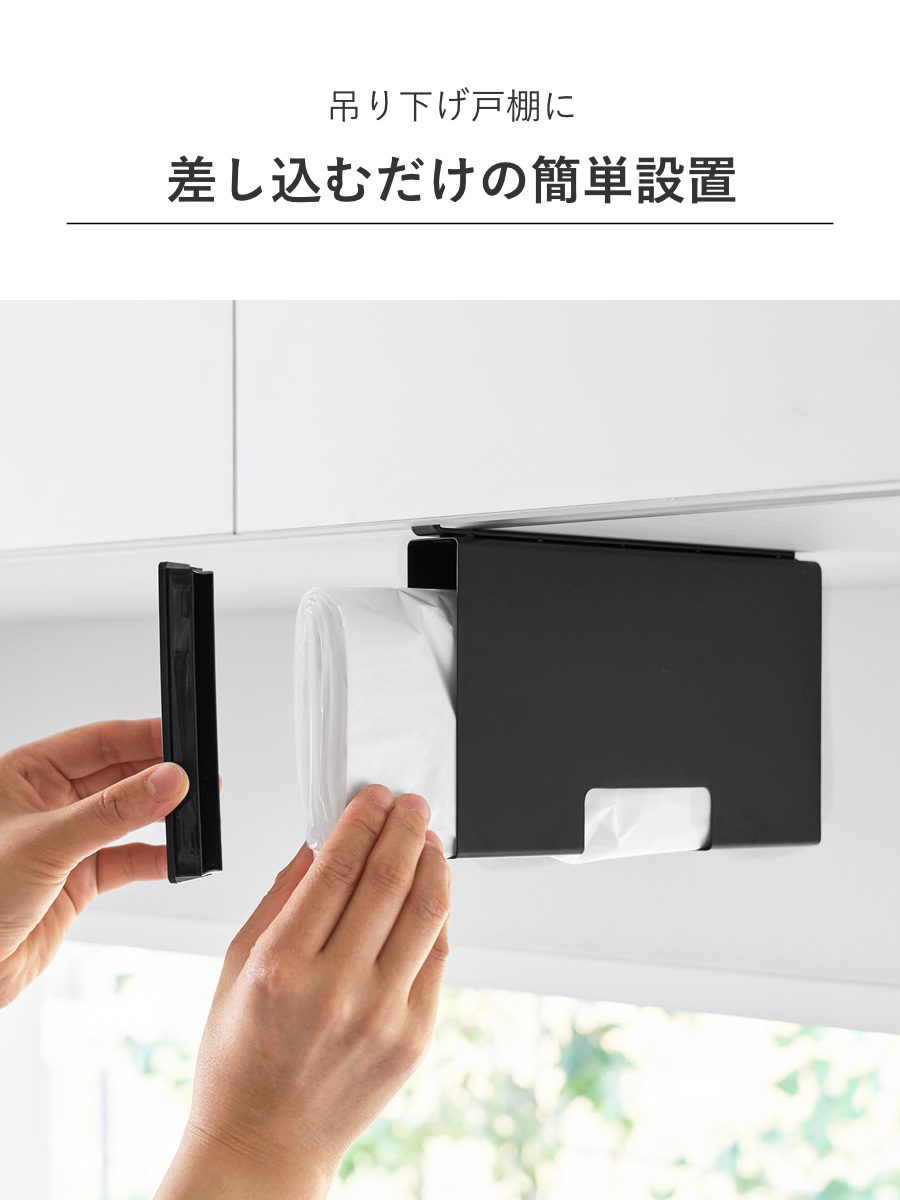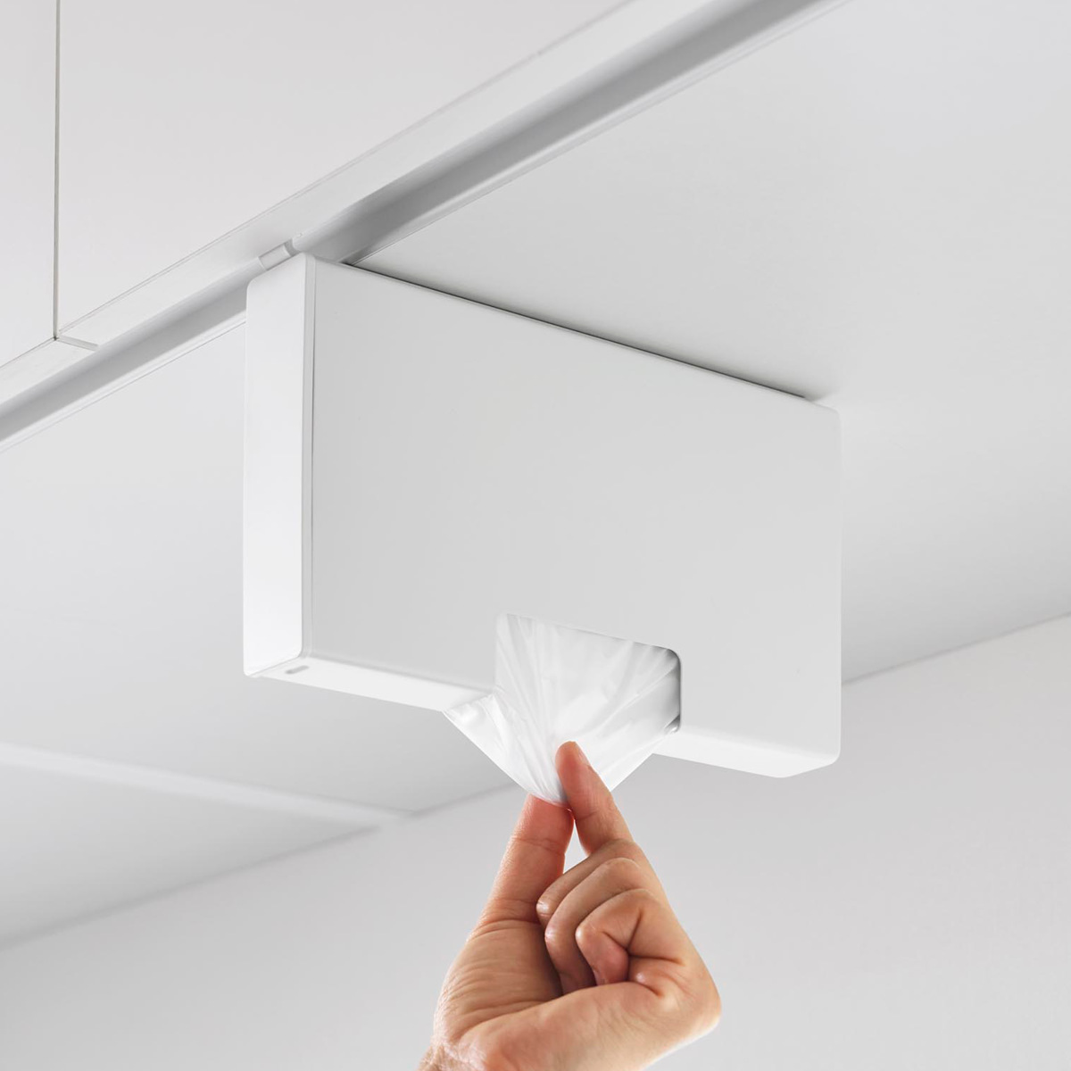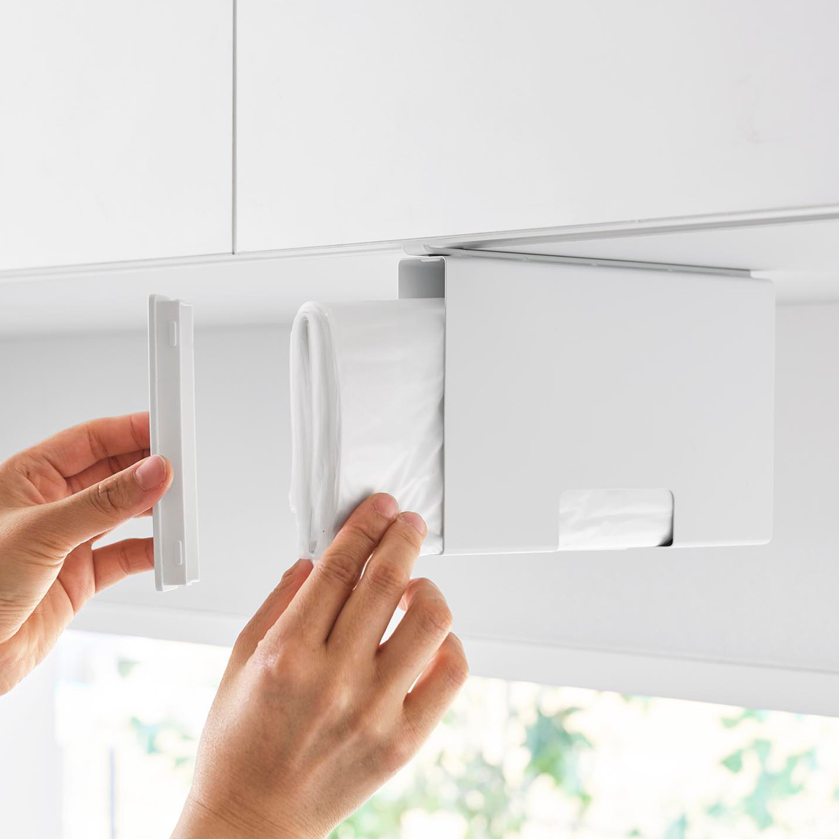 吊り下げ戸棚に差し込むだけの簡単設置で気軽に使用できるポリ袋収納ホルダーです。調理中や片付けの際、必要な時に片手でサッとポリ袋を取り出せます。蓋を開けて入れるだけで補充もスムーズです。