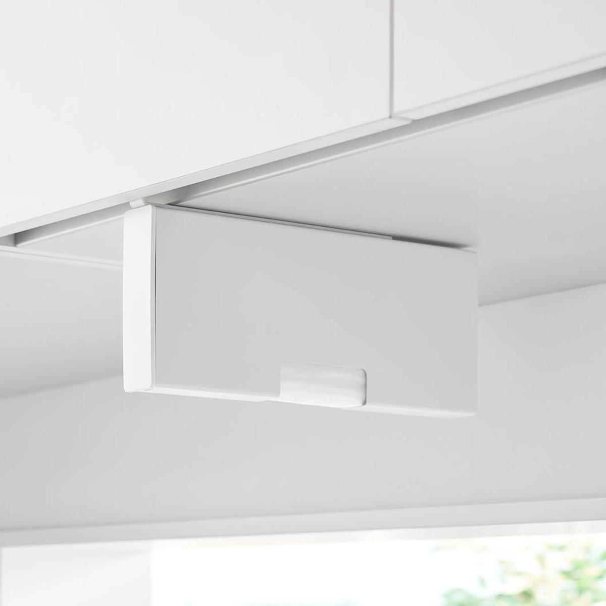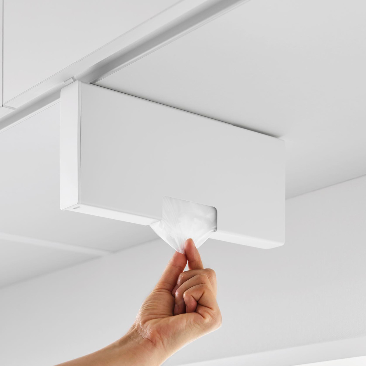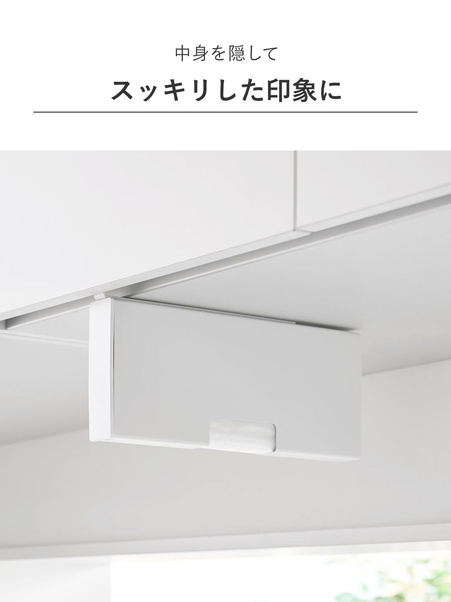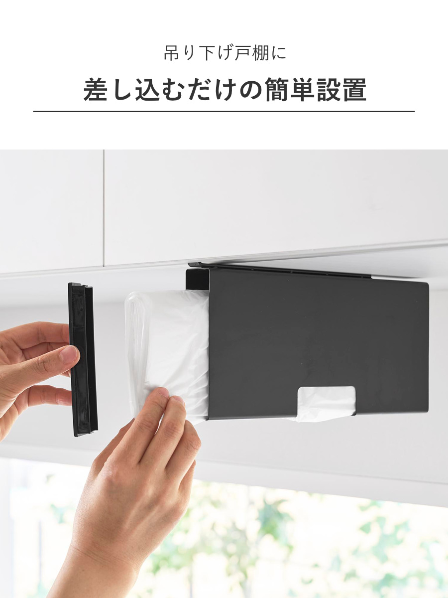 吊り下げ戸棚に差し込むだけの簡単設置で気軽に使用できるポリ袋収納ホルダーです。調理中や片付けの際、必要な時に片手でサッとポリ袋を取り出せます。蓋を開けて入れるだけで補充もスムーズです。