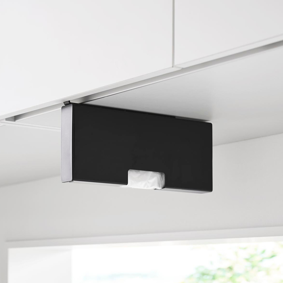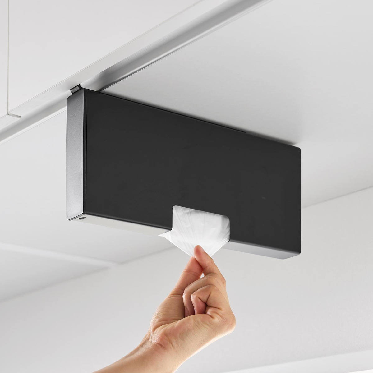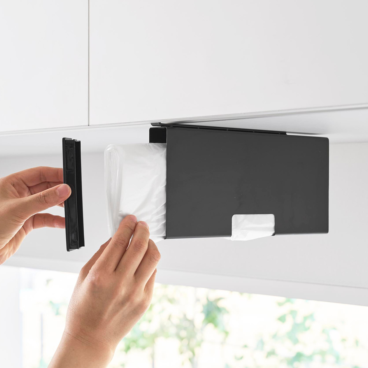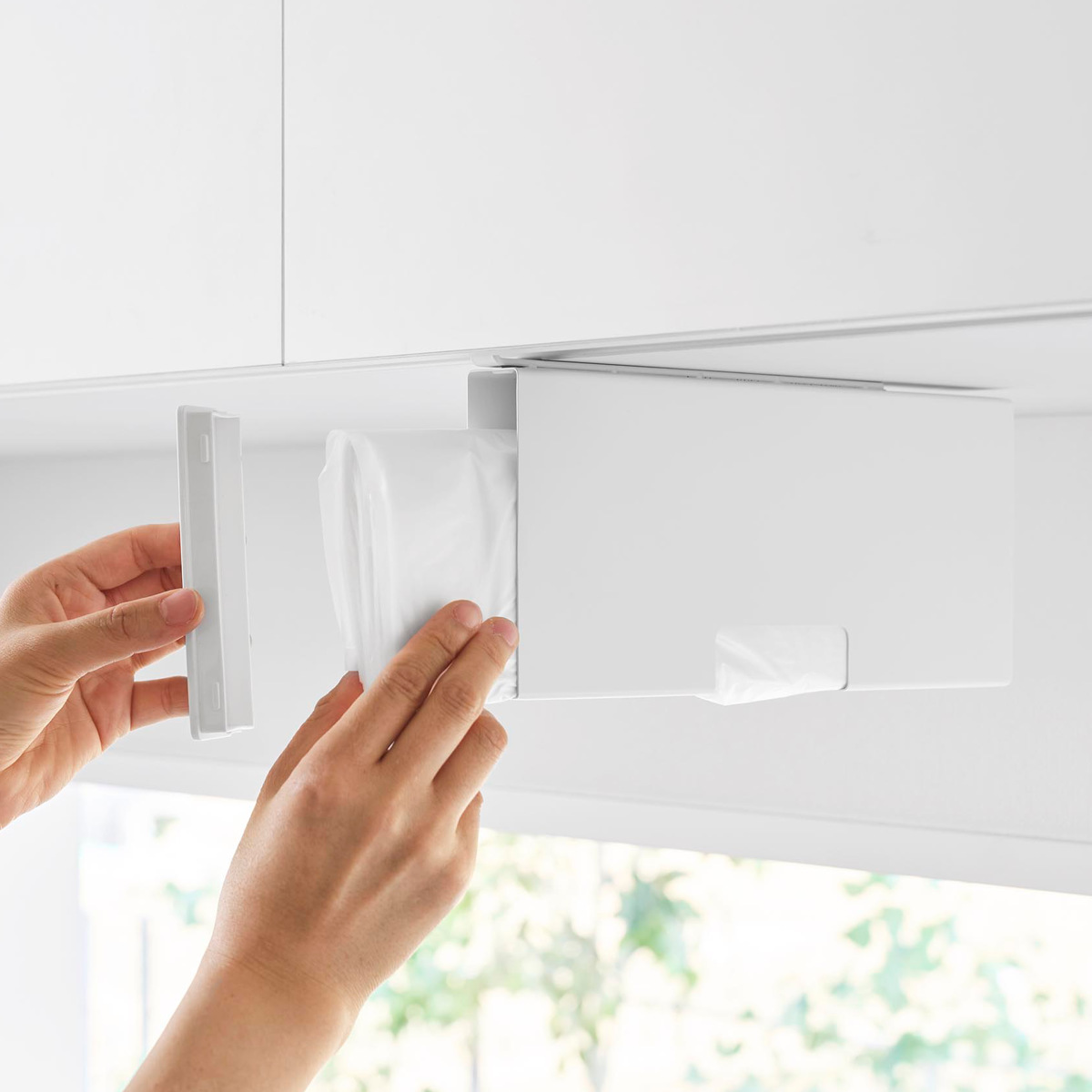 吊り下げ戸棚に差し込むだけの簡単設置で気軽に使用できるポリ袋収納ホルダーです。調理中や片付けの際、必要な時に片手でサッとポリ袋を取り出せます。蓋を開けて入れるだけで補充もスムーズです。