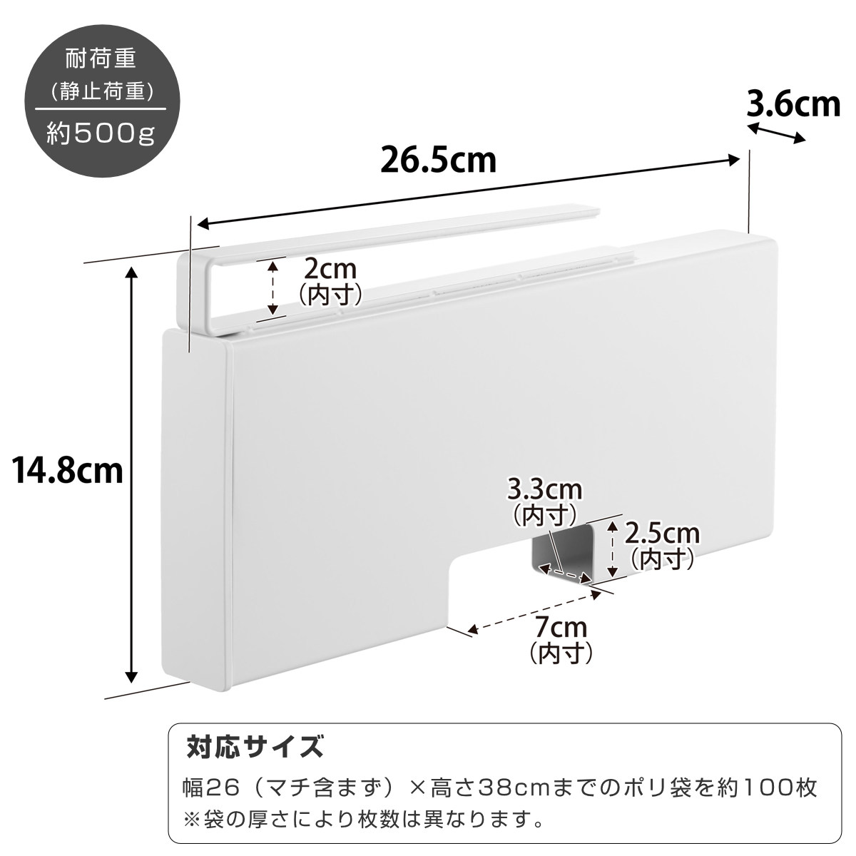 | 対応サイズ | 幅26(マチ含まず)×高さ38cmまでのポリ袋を約100枚(袋の厚さにより枚数は異なります。) |