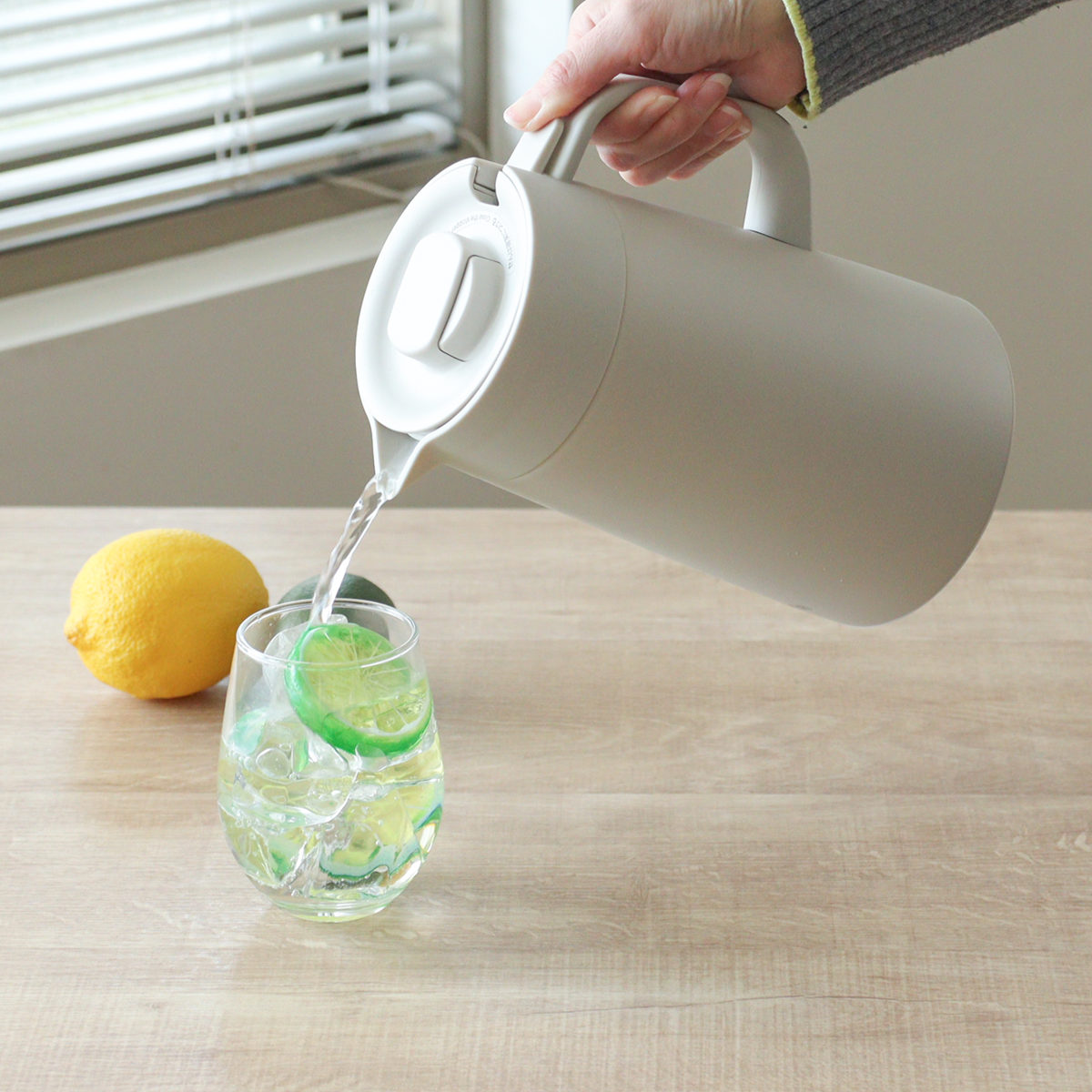 レバーをプッシュして傾けると中の飲み物が出る構造です。取っ手を持ちながら押すことで、スムーズに注げます。