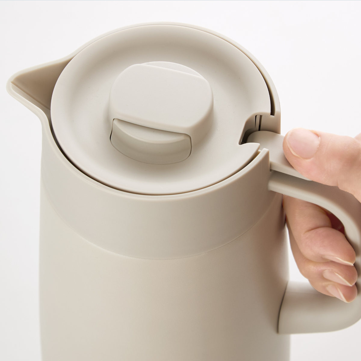 簡単に素早く着脱できるワンタッチふたを採用しました。手指の大きさにかかわらず開閉レバーがつまみやすいよう、すっきりとしたデザインに仕上げました。