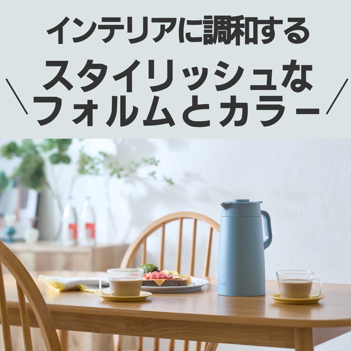 軽くて丈夫なステンレス製の真空二重構造により、高い断熱効果を発揮し、入れたての温度を長時間保ちます。朝入れたコーヒーやお茶はお昼になっても飲みごろの温度をキープし、電気を使わず省エネで、ダイニングやリビングでゆっくりと飲み物を楽しめます。