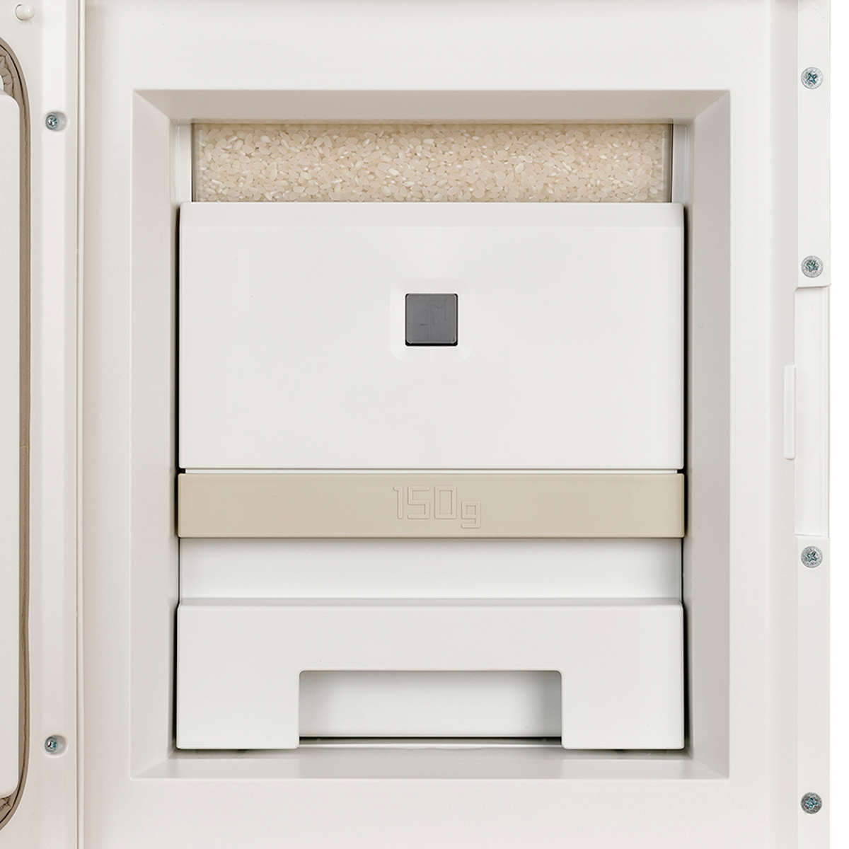 レバーを引くだけのスライド式計量で、手軽にお米を量れます。米受けは最大6合まで入るため、まとめて準備したいときも安心です。1回のレバー操作で1合(約150g)を計量できるため、必要な量を正確に取り出せます。