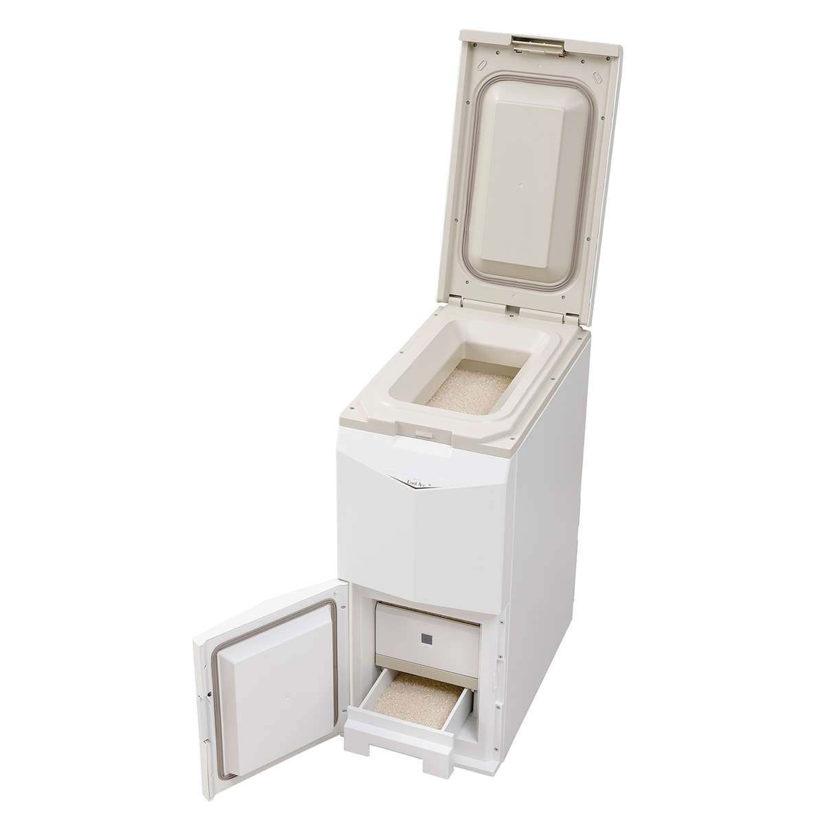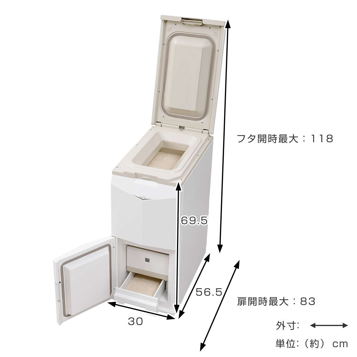 | サイズ | 約 幅30×奥行56.5×高さ69.5(cm) 扉開時最大:約 奥行83(cm) フタ開時最大:約 高さ118(cm) 米投入口:幅13.3×奥行29.4(cm) |