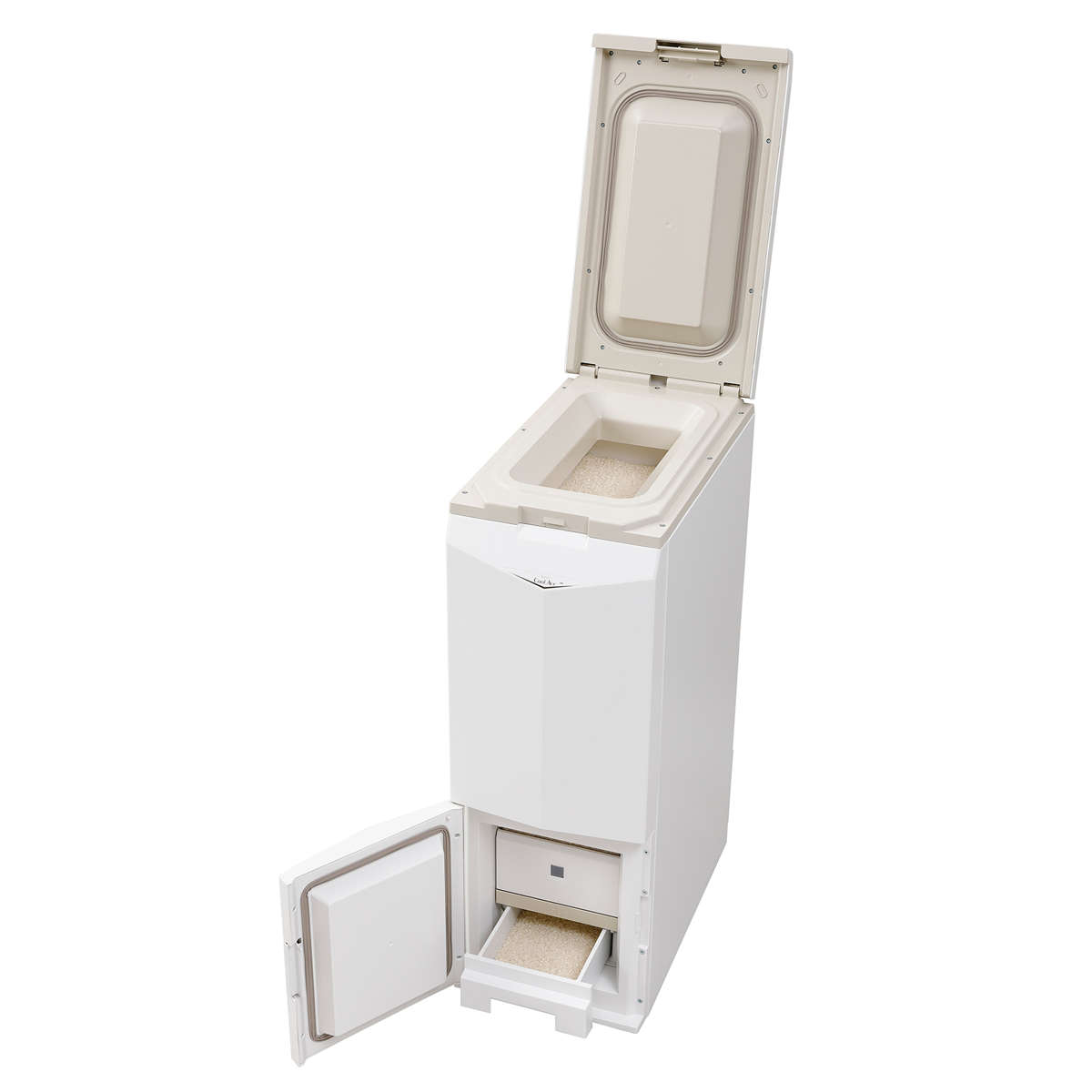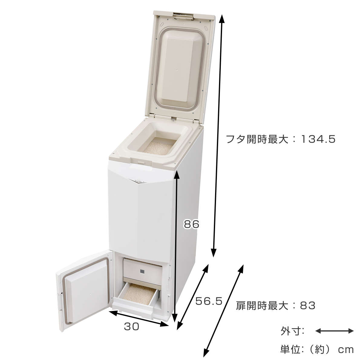 | サイズ | 約 幅30×奥行56.5×高さ86(cm) 扉開時最大:約 奥行83(cm) フタ開時最大:約 高さ134.5(cm) 米投入口:幅13.3×奥行29.4(cm) |