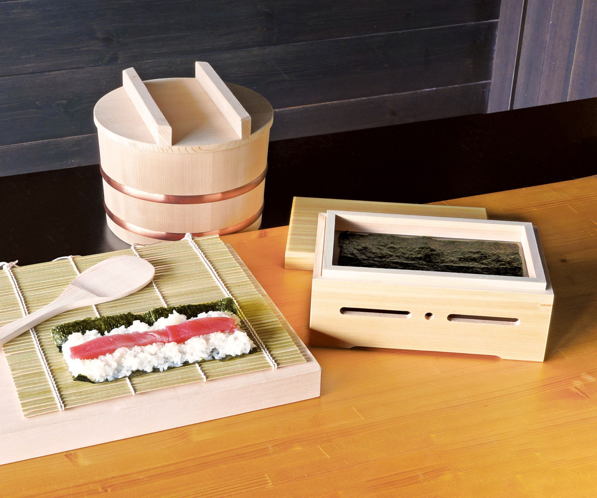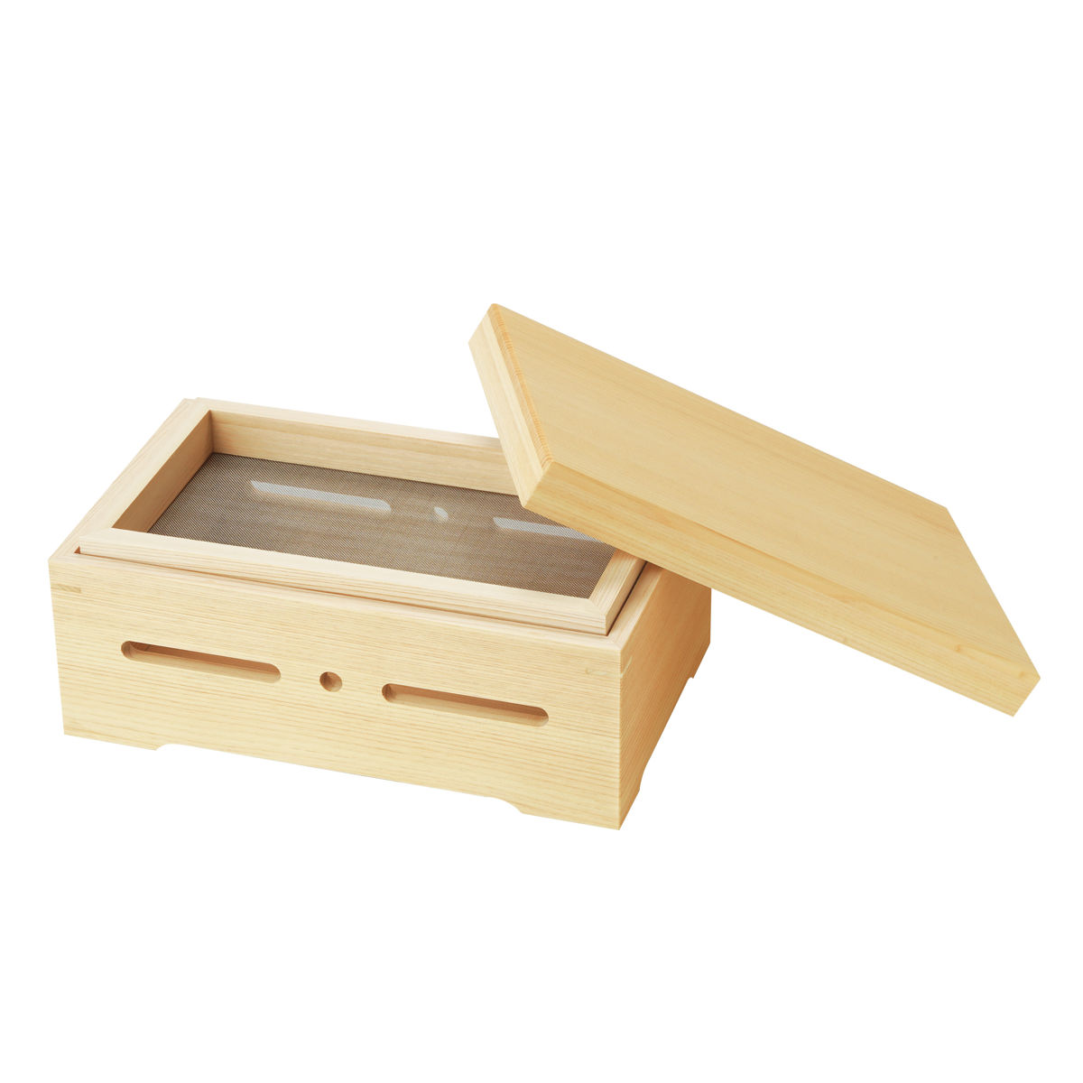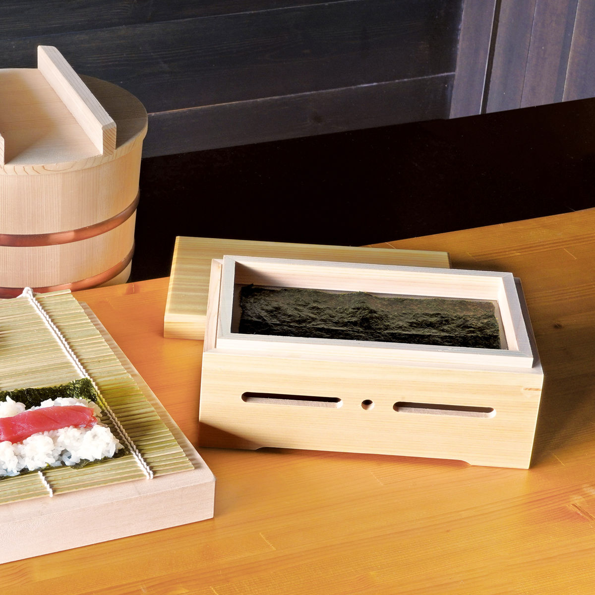 海苔を入れ、炭火でじんわり温めることで香りや風味をより引き立たせる木製小箱です。湿気を飛ばすことでパリッとした海苔の食感が楽しめます。大サイズは手巻き寿司用の半切海苔、おにぎり用の3切海苔など、多様なサイズの海苔に対応しています。オープンキッチンや店頭販売など、お客さんの前で調理するもてなし時に、魅せる道具としても活躍します。