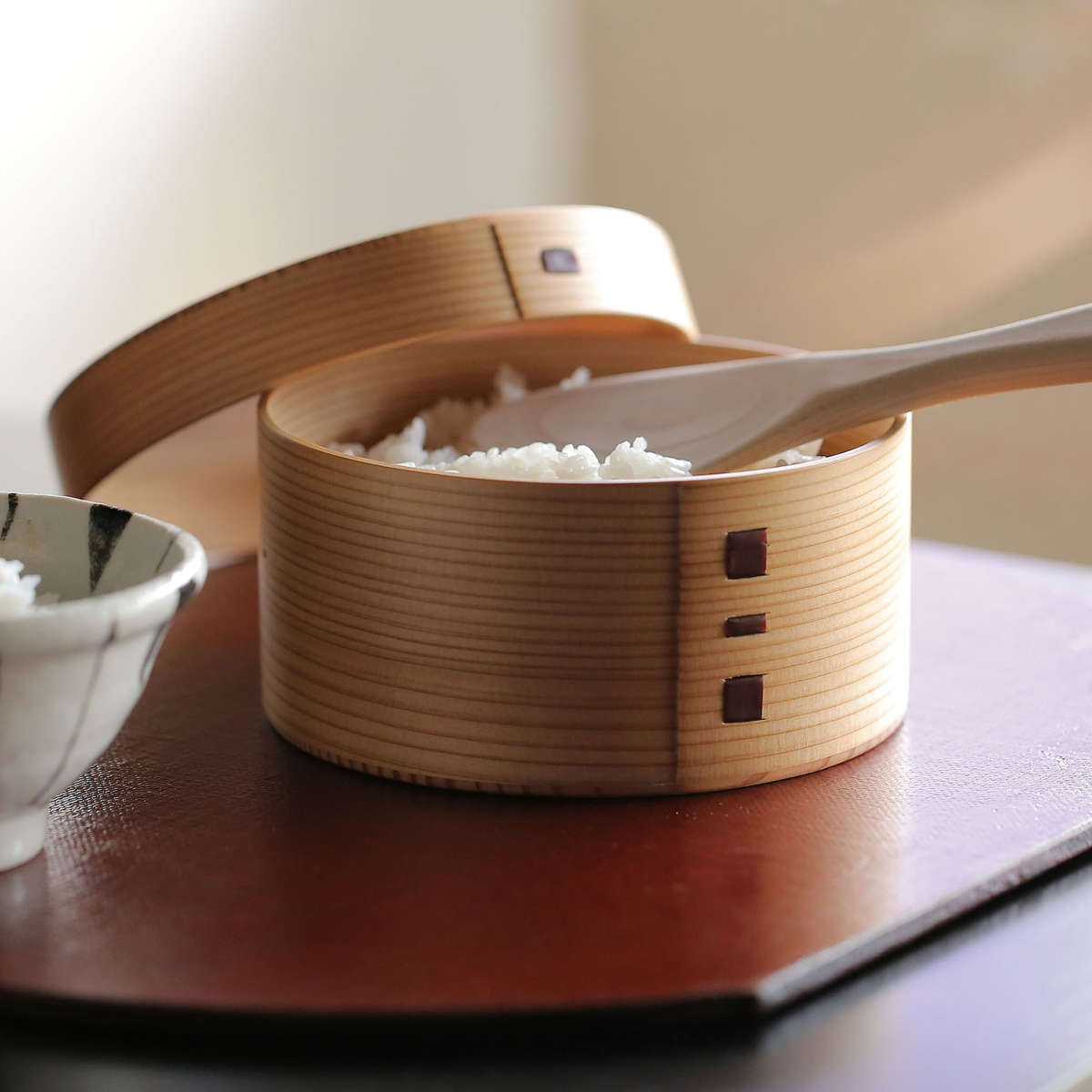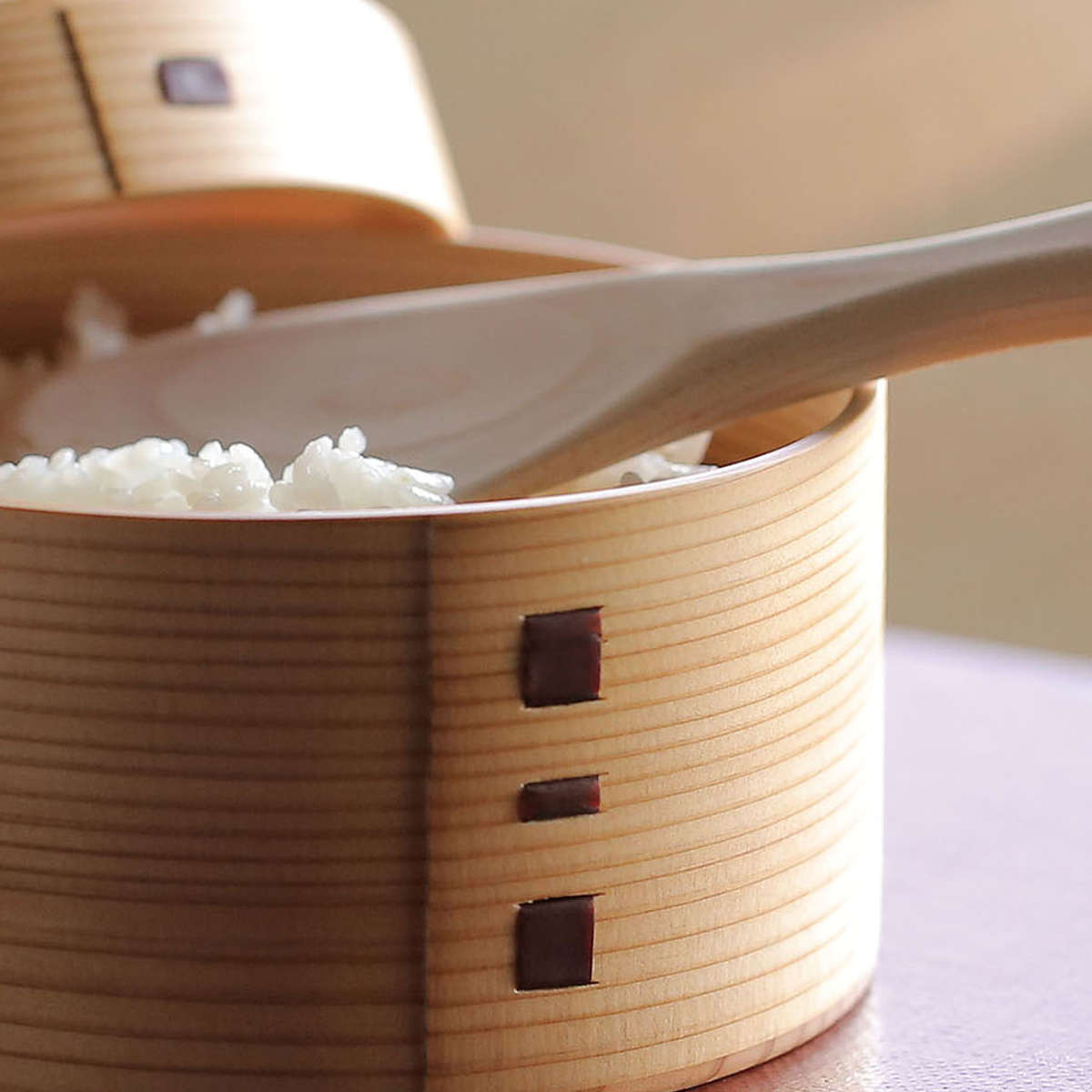 無塗装の杉が余分な水分を吸収し、炊きたてご飯の粗熱を適度に逃がすことで水分量をコントロール。冷めてもふっくらやわらかく、自然な甘みが引き立つご飯に仕上がります。