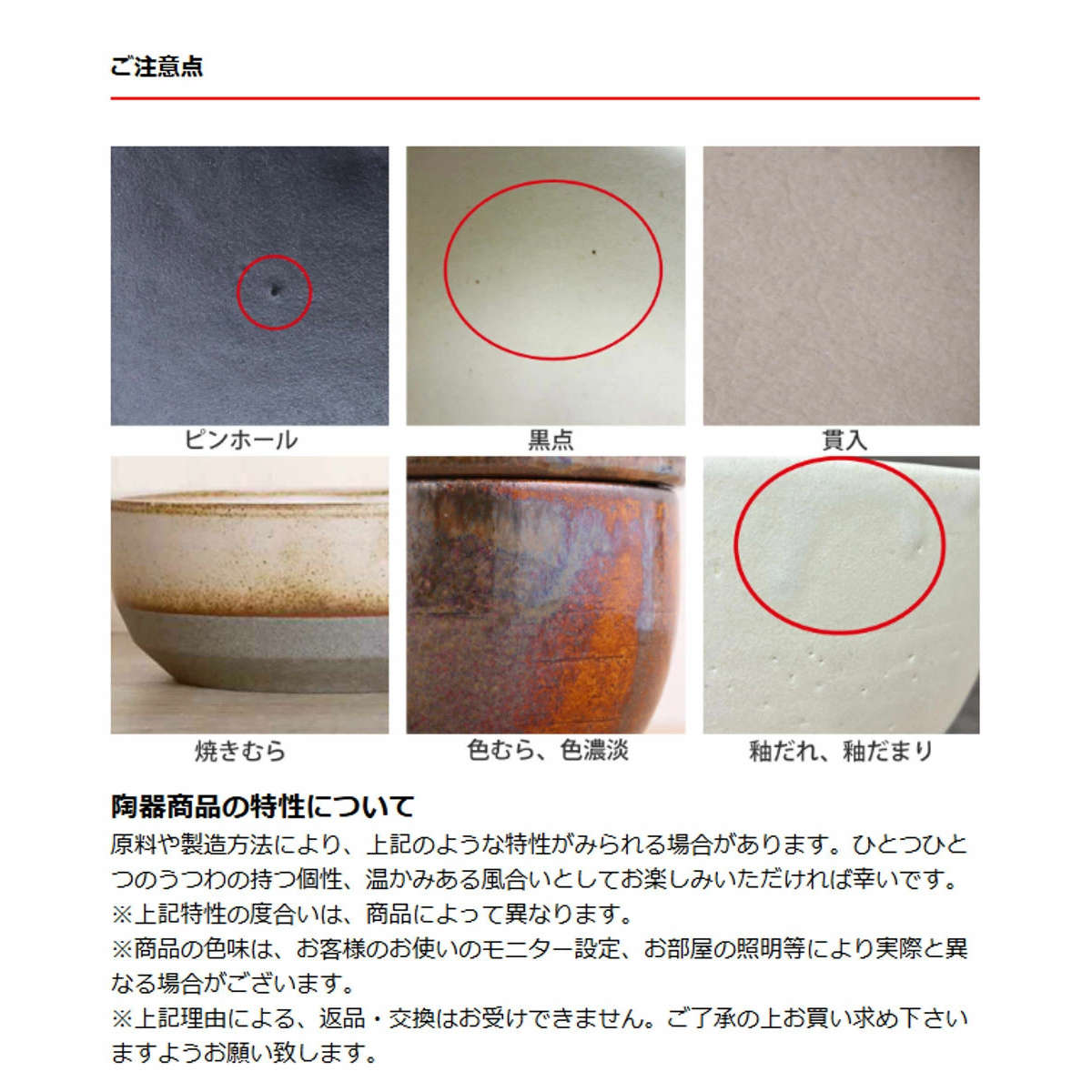 原料や製造方法により、上記のような特性がみられる場合があります。ひとつひとつのうつわの持つ個性、温かみある風合いとしてお楽しみいただければ幸いです。
