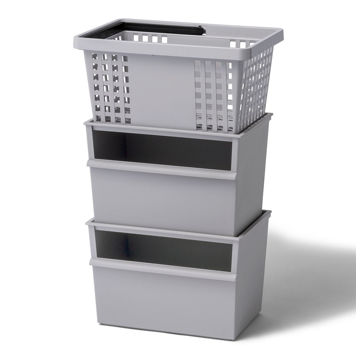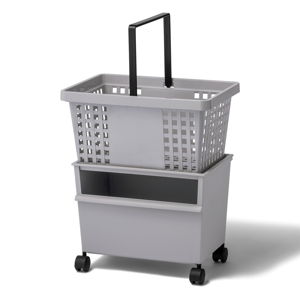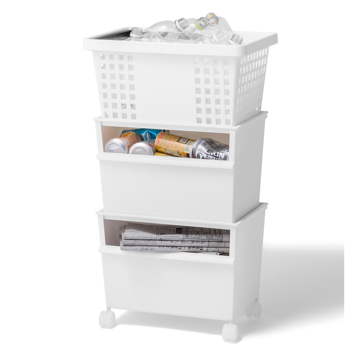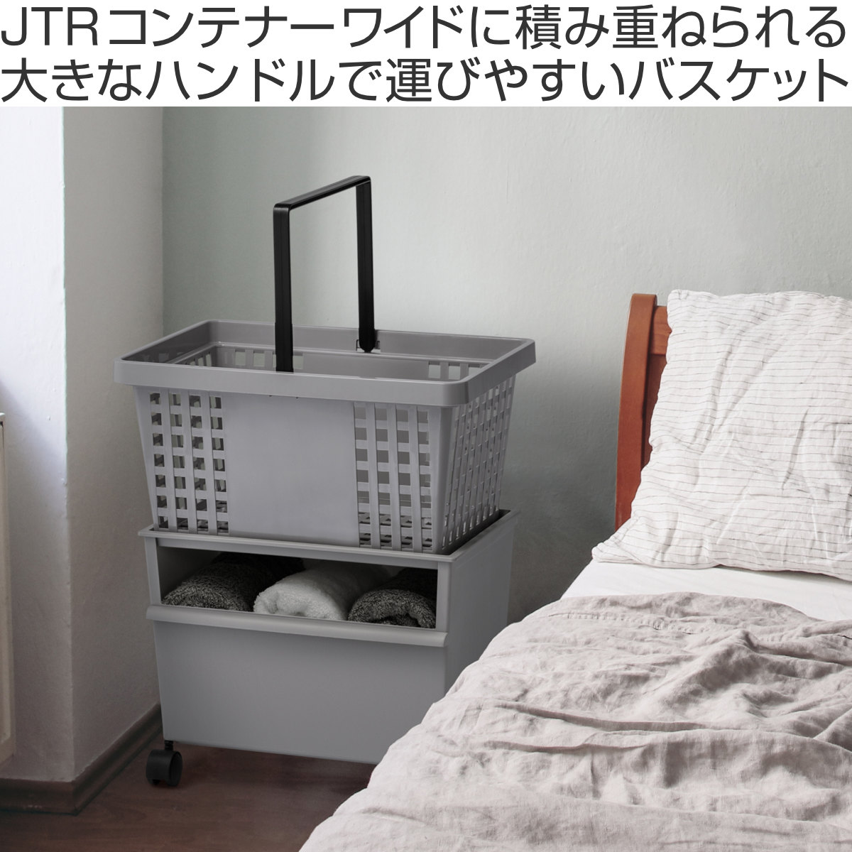 キャリーバスケットは、カラーボックスにぴったり収まる「Just itシリーズ」のコンテナー〈ワイドサイズ〉に、別売りのフタをプラスすることで積み重ねて使用できます。